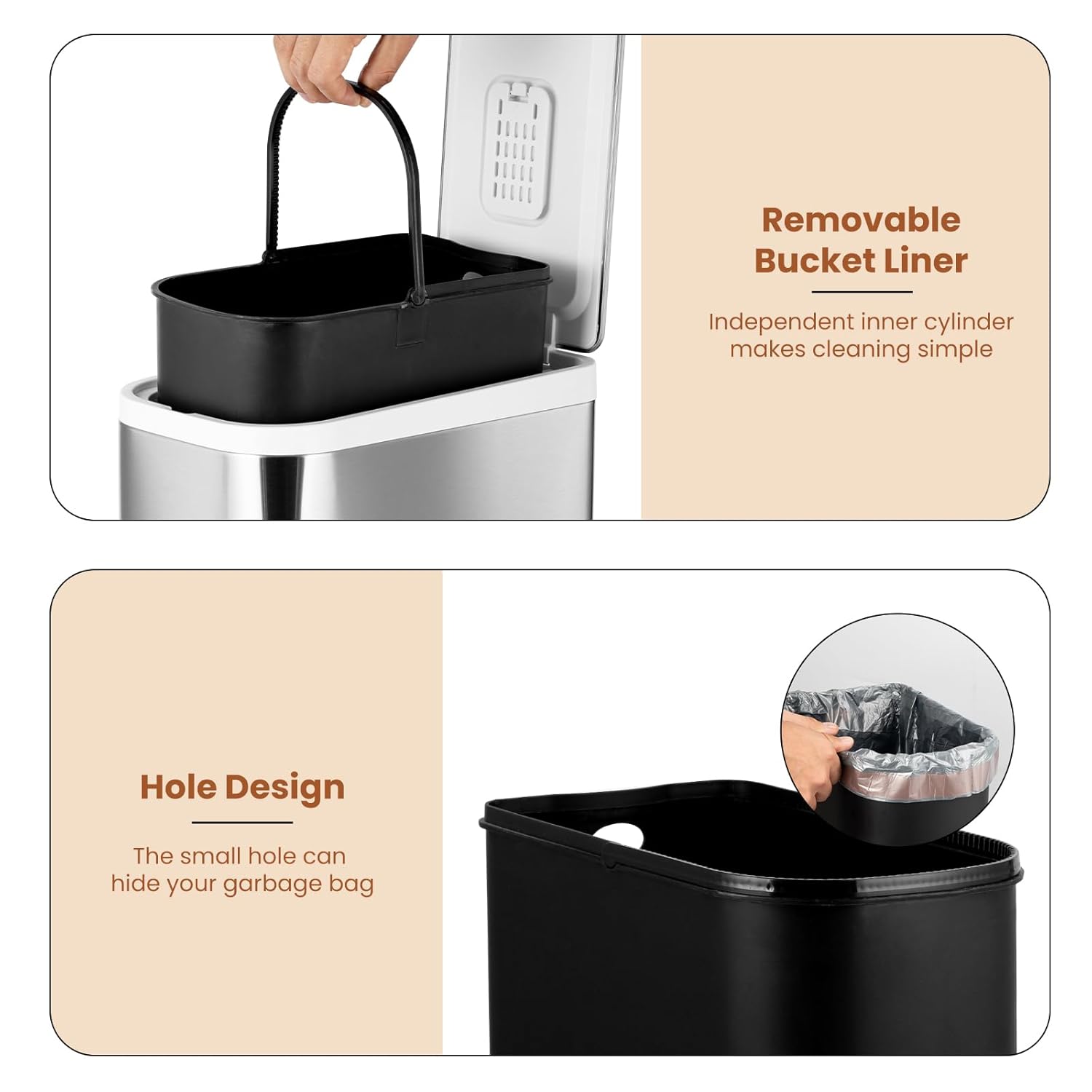 • Removable Plastic Inner Bucket: The bin comes with a removable plastic inner bucket, making it convenient to empty and clean. You can easily take out the inner bucket to dispose of the garbage.
