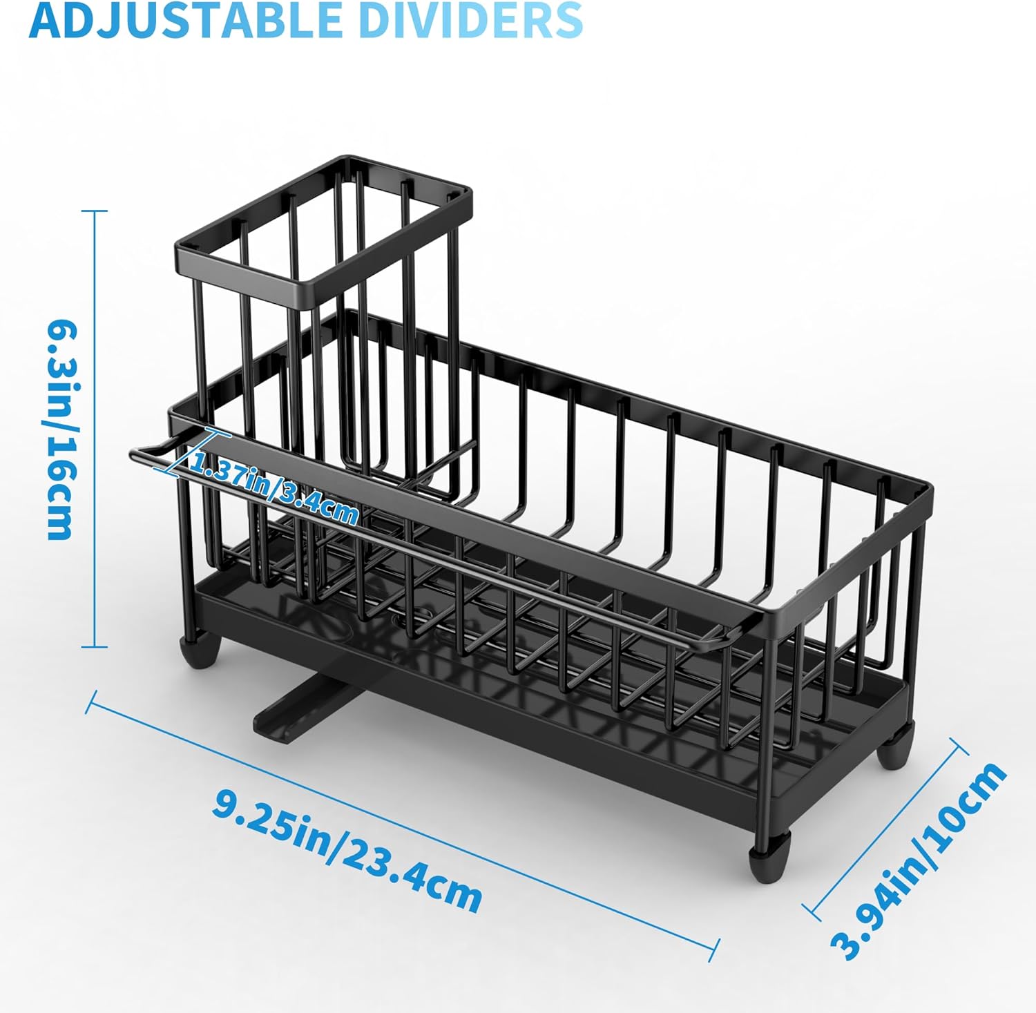 - 【ONE-STOP SOLUTION TO SINK CLUTTER】Cisily sink caddy can store two bottles of dishwashing detergent, two sponges, four kitchen brushes, a sink plug, and a dish towels.