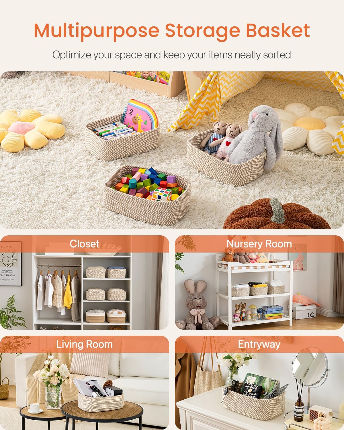 - [ Compact Storage Basket ] Our small basket measures 12"L x 8"W x 4.5"H, designed to organize your small items, help you save valuable time and energy in tidying up your room, thereby keeping your home tidy and saving space. A set of 3 small rectangle baskets allow you to categorize and organize cosmetics, toiletries, towels, cat/dog toys, diaper, nursery necessaries, keys, purse, snacks, office supplies and more