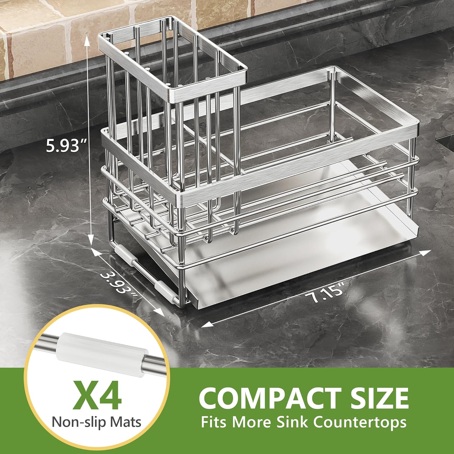 Cisily Sink Caddy Sponge Holder for Kitchen with Brush Holder and Stainless Steel Self Drain Tray, Rustproof Kitchen Sink Organizer for Sponge, Soap Dispenser Storage Accessories (Stainless Steel)