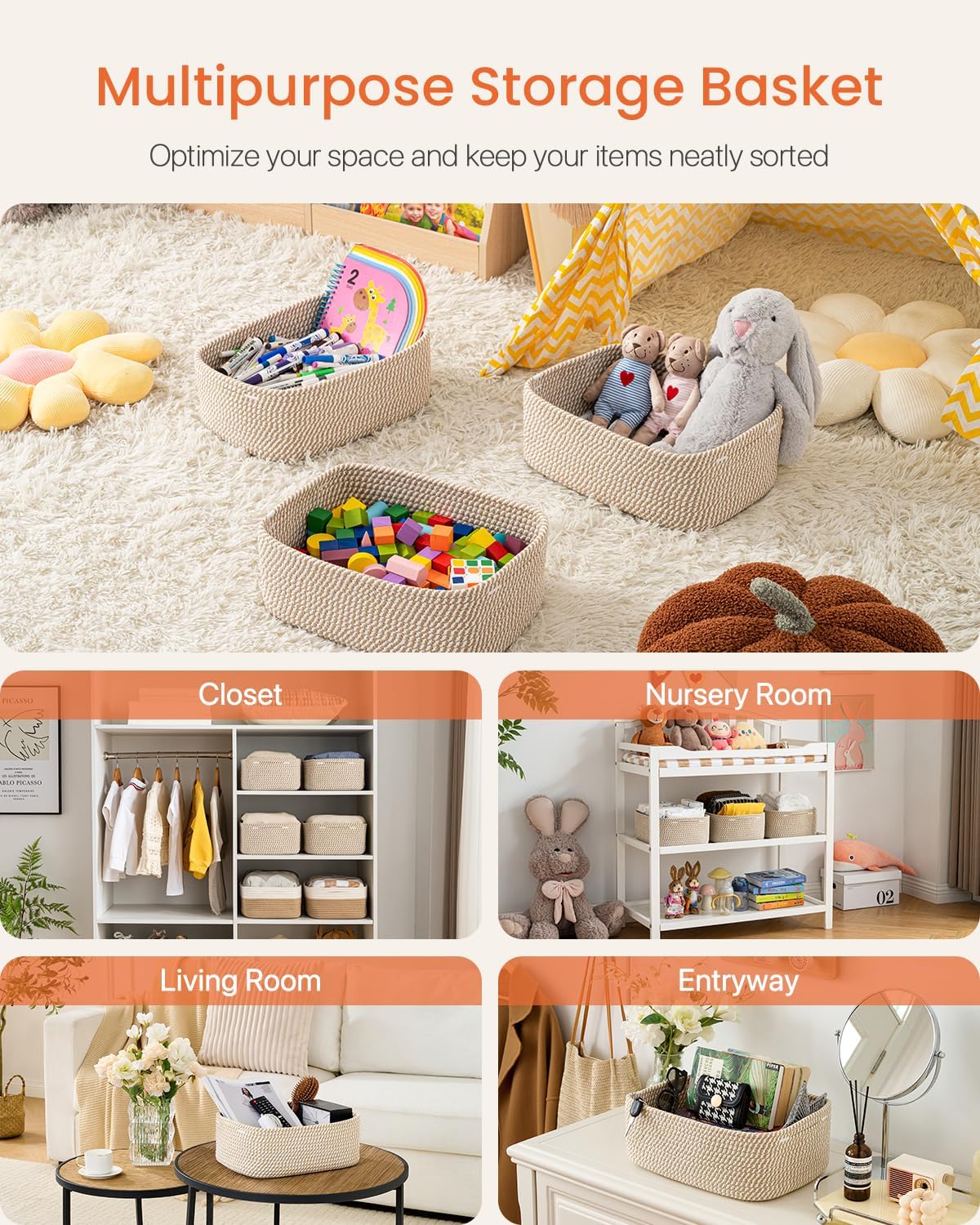 - [ Elegantly Designed to Match Any Décor ] Our small rope basket creates a minimalist appearance, and it adds a touch of warmth and texture to any room. The classic solid color design ensures seamless integration with your existing aesthetics, complementing any decoration. Perfect as decorative storage baskets for shelves, cabinets, and any open display space, making them a stylish and practical addition to any decor, enhancing the overall aesthetics of your room