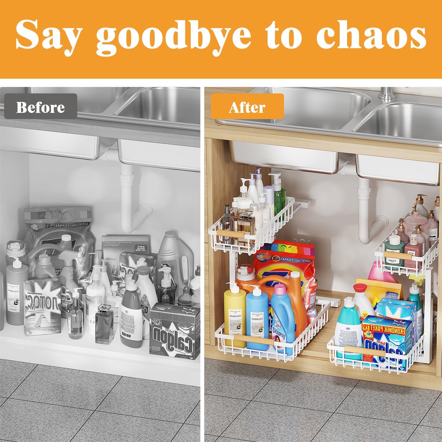 • 2-Tier Pull-Out Storage Baskets: The 2-tier under-sink organizer features smooth sliding rails, ensuring both upper and lower baskets slide out effortlessly without jamming or making noise. The dual-slide functionality makes accessing deep cabinet items easy, especially in deep cabinets.