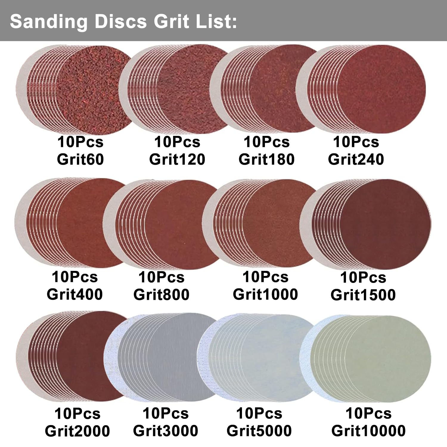 - Comprehensive 120 Pcs Sanding Discs Kit--This 150pcs set includes 120pieces 3 inch sanding discs sandpaper in grit 60 120 180 240 400 800 1000 1500 2000 3000 5000 10000 (10 pieces each grit), 2 types upgraded backing pads with 1/4" shank, 2 pcs soft foam buffering pad, 2 pcs wool buffing pad, 1 pc flat orange polishing pad and 1 pc wave orange polishing pad.