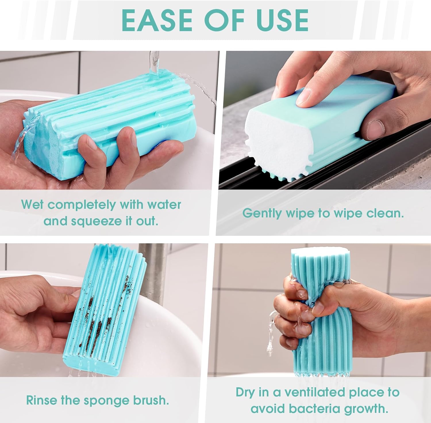 • Multi-purpose: This sponge is ideal for cleaning blinds, baseboards, taps, window track recesses, railings, mirrors, hair, glass, and ceiling fan blades.