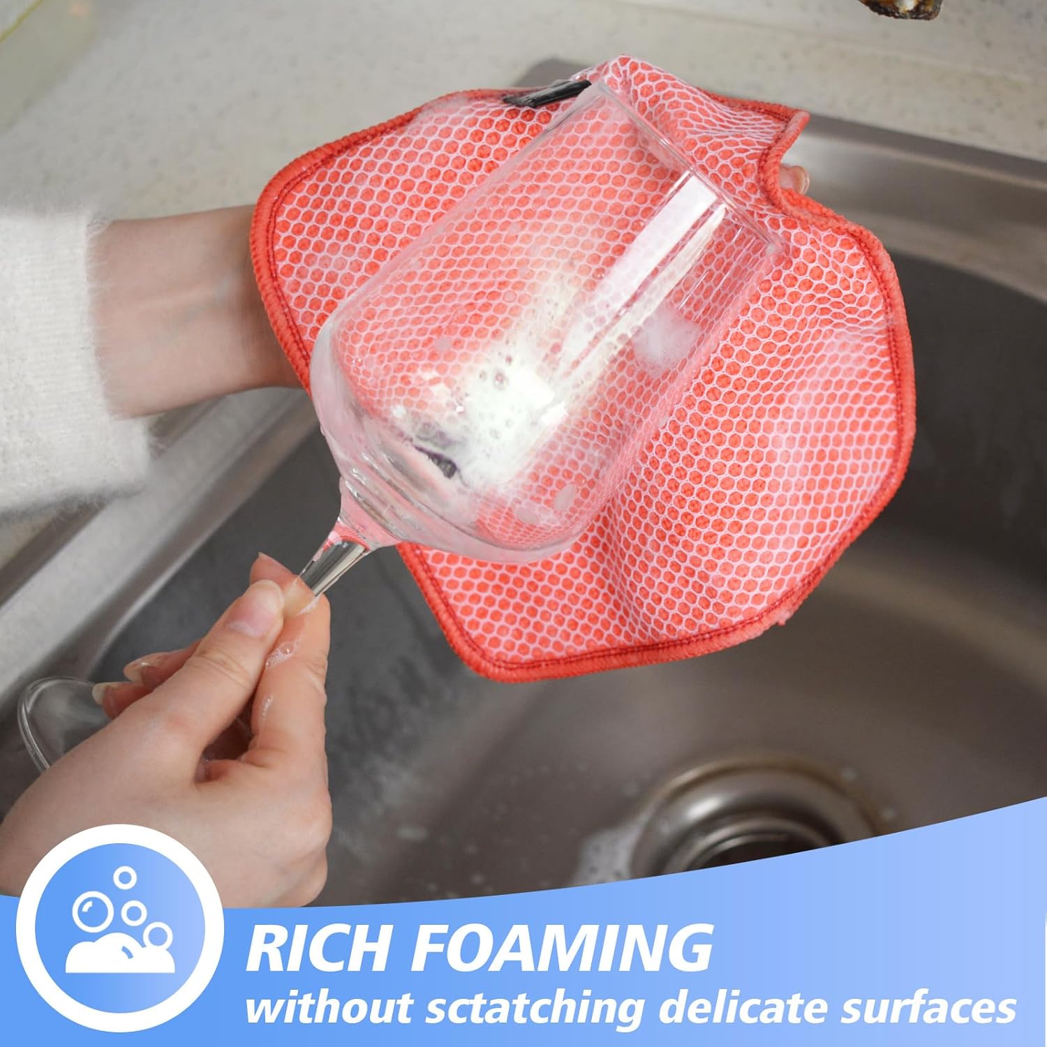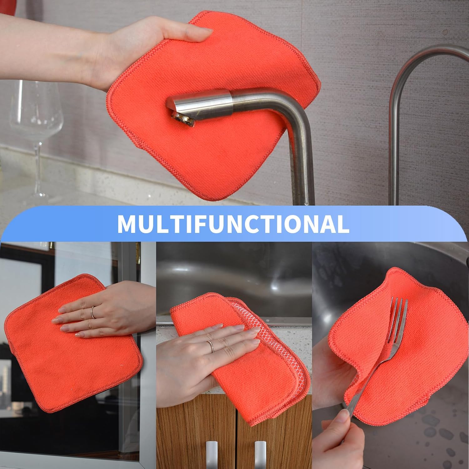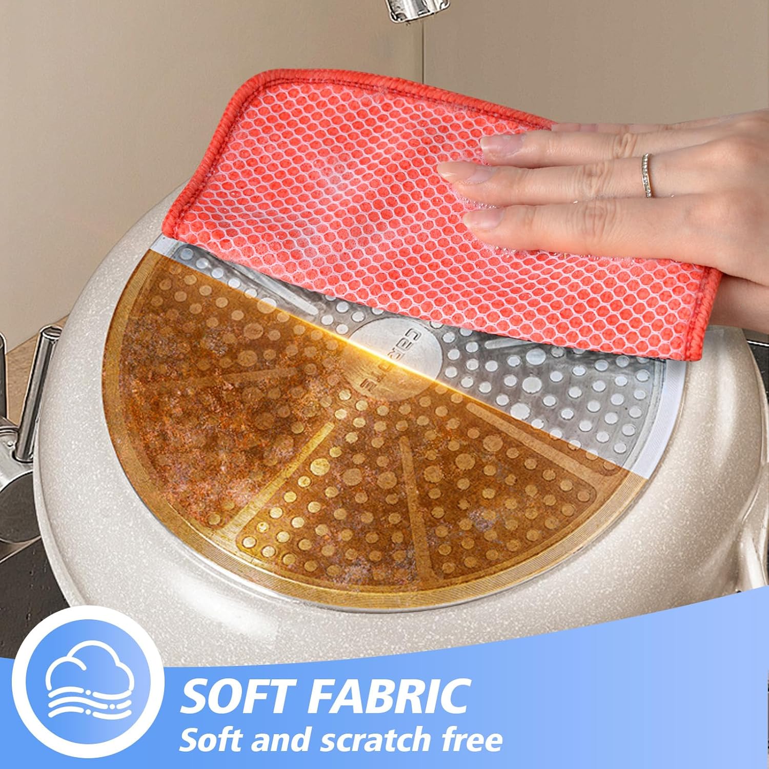• DISH RAGS FOR KITCHEN CLEANING WITH POLY SCOUR SCRUBBING SIDE: One side is microfiber and the other side is mesh. The microfiber side works well at getting finger spots off the stainless steel appliances and the glass front of fridge or stove, microwave; the scrubby side is good for cleaning stuck on food without having to grab your scraper and does not scratch delicate surfaces either