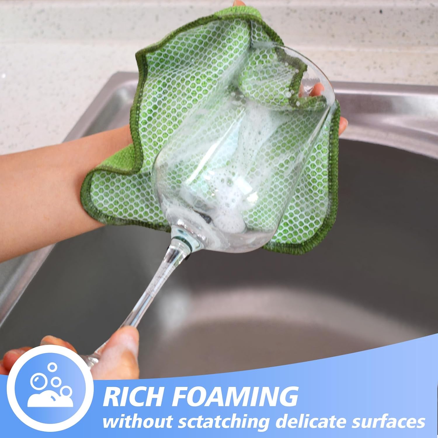 • DISH RAGS FOR KITCHEN CLEANING WITH POLY SCOUR SCRUBBING SIDE: One side is microfiber and the other side is mesh. The microfiber side works well at getting finger spots off the stainless steel appliances and the glass front of fridge or stove, microwave; the scrubby side is good for cleaning stuck on food without having to grab your scraper and does not scratch delicate surfaces either