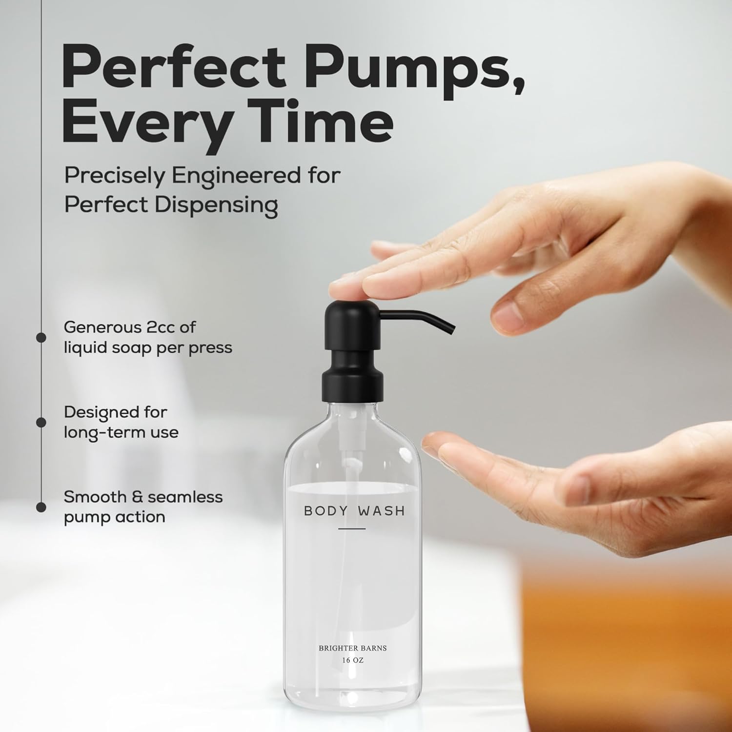 Clear Shampoo and Conditioner Dispenser Set by Brighter Barns - Body Wash, Shampoo Dispenser for Shower with Pump - Refillable Plastic Shower Bottles for Bathroom Decor in Home, Airbnb, Hotel (Clear)