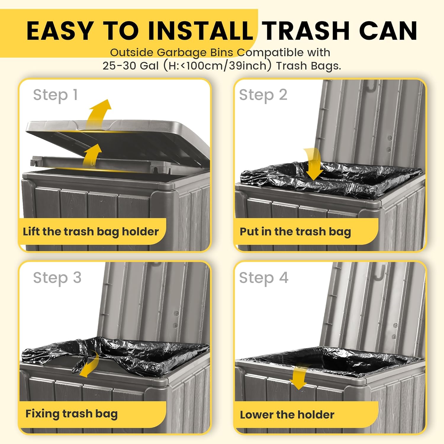 • aterproof Material - The outdoor garbage can is made of stable and recyclable resin material that is waterproof and fade resistant. The panels are sturdy and will not bend, warp or break easily and are highly weather resistant.