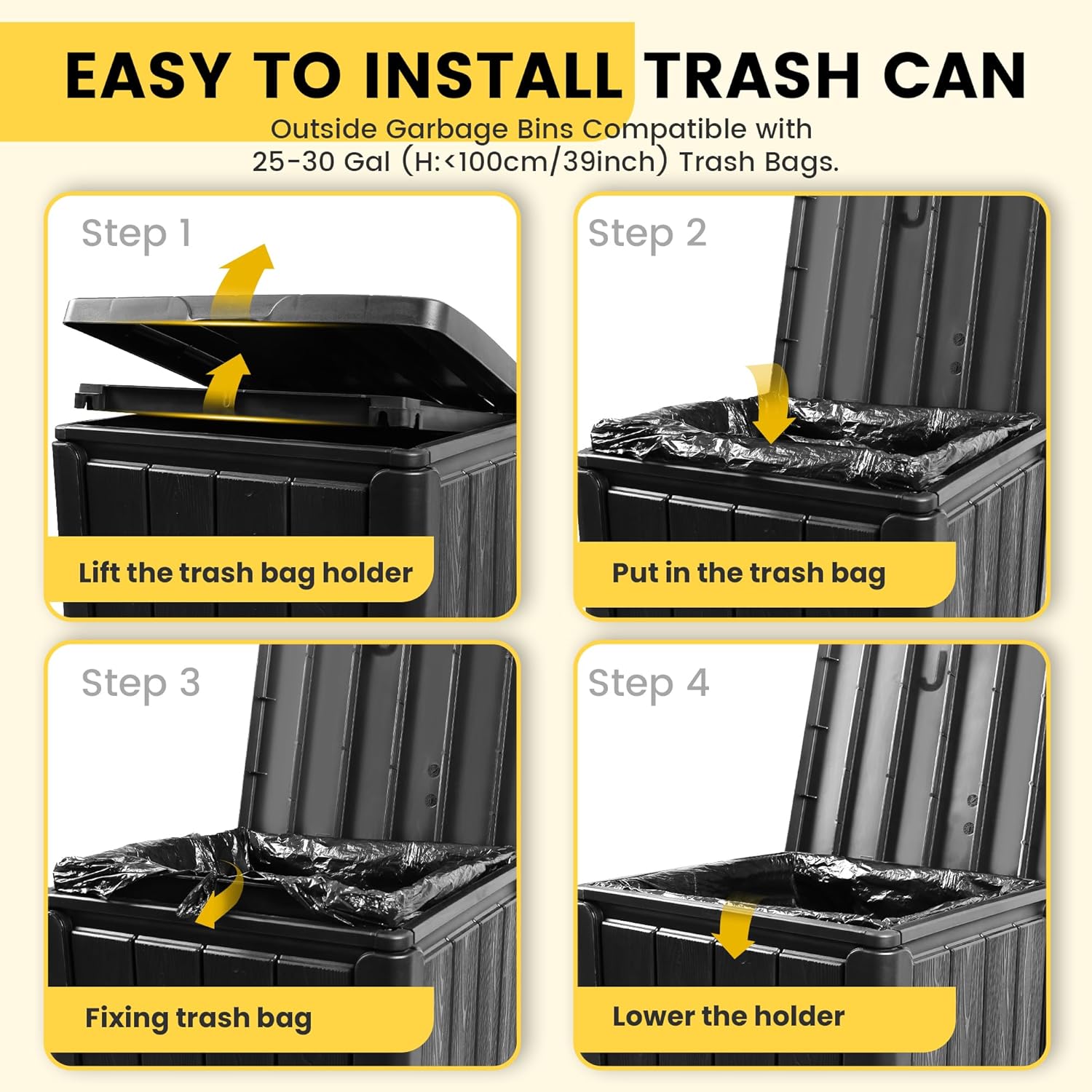 • Quick Install - This outdoor trash bin comes with a detailed user manual. No screws or tools required, just snap the panels together and the installation can be completed in about 10 minutes.