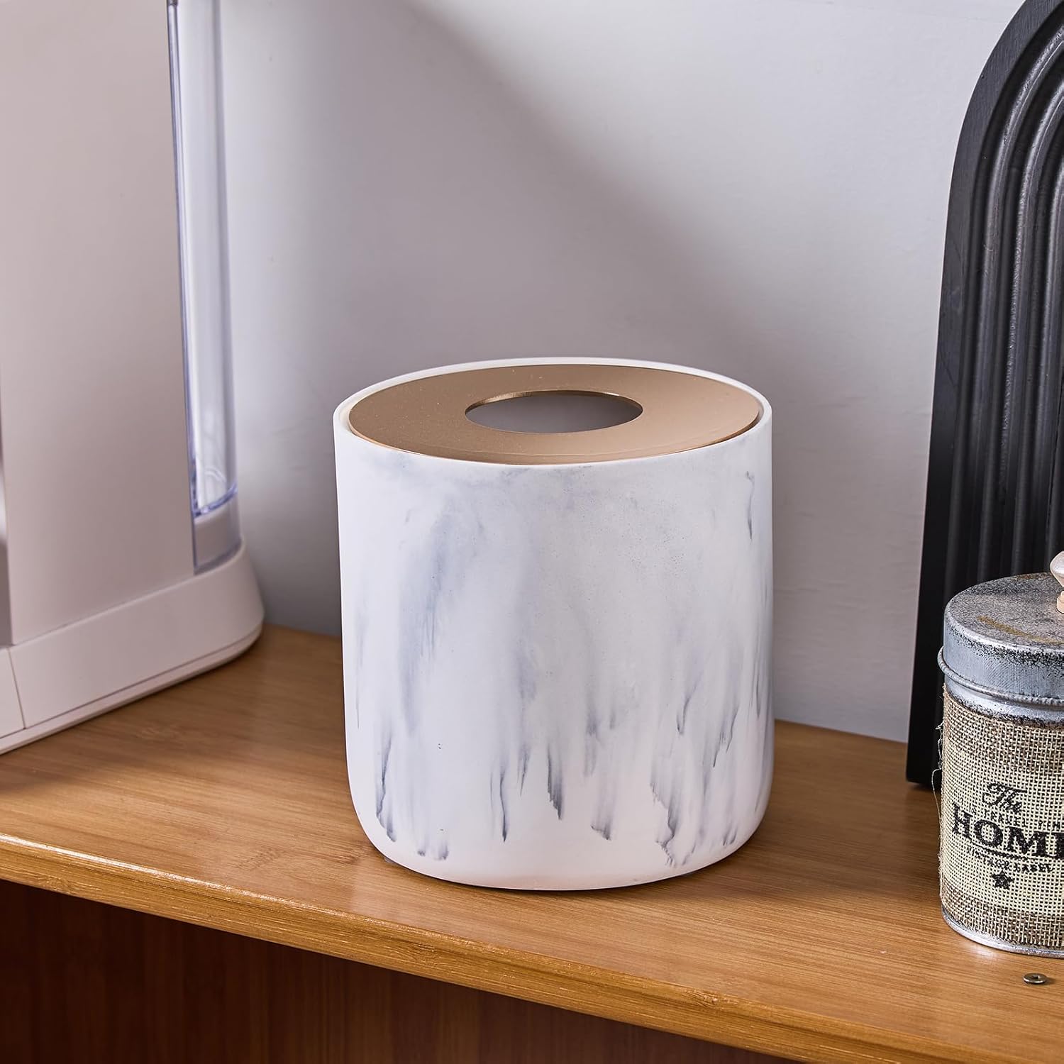 White Marble Textural Mini Trash Can with Rose Gold Stainless Steel Lid, Small Countertop Trash Can for Bathroom Kitchen,Desk Trash Can,Table top Mini Garbage Cans,Resin Tiny Waste Basket for Vanity