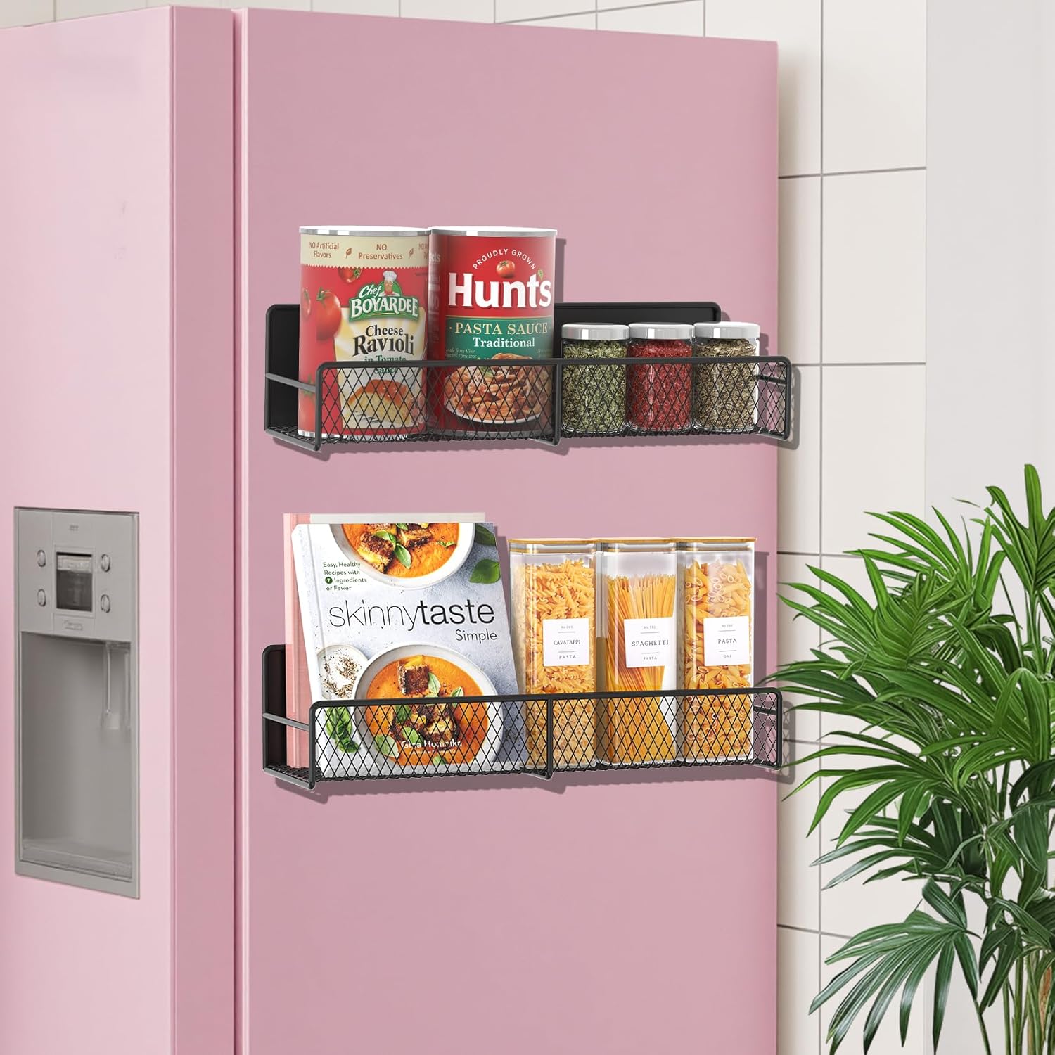 • Compact Space-Saving Storage – Turn unused vertical space into functional storage. Measuring 11.2" and 11.85" wide, these magnetic shelf for fridge hold jars, condiments, or oil bottles without taking up valuable counter or cabinet space