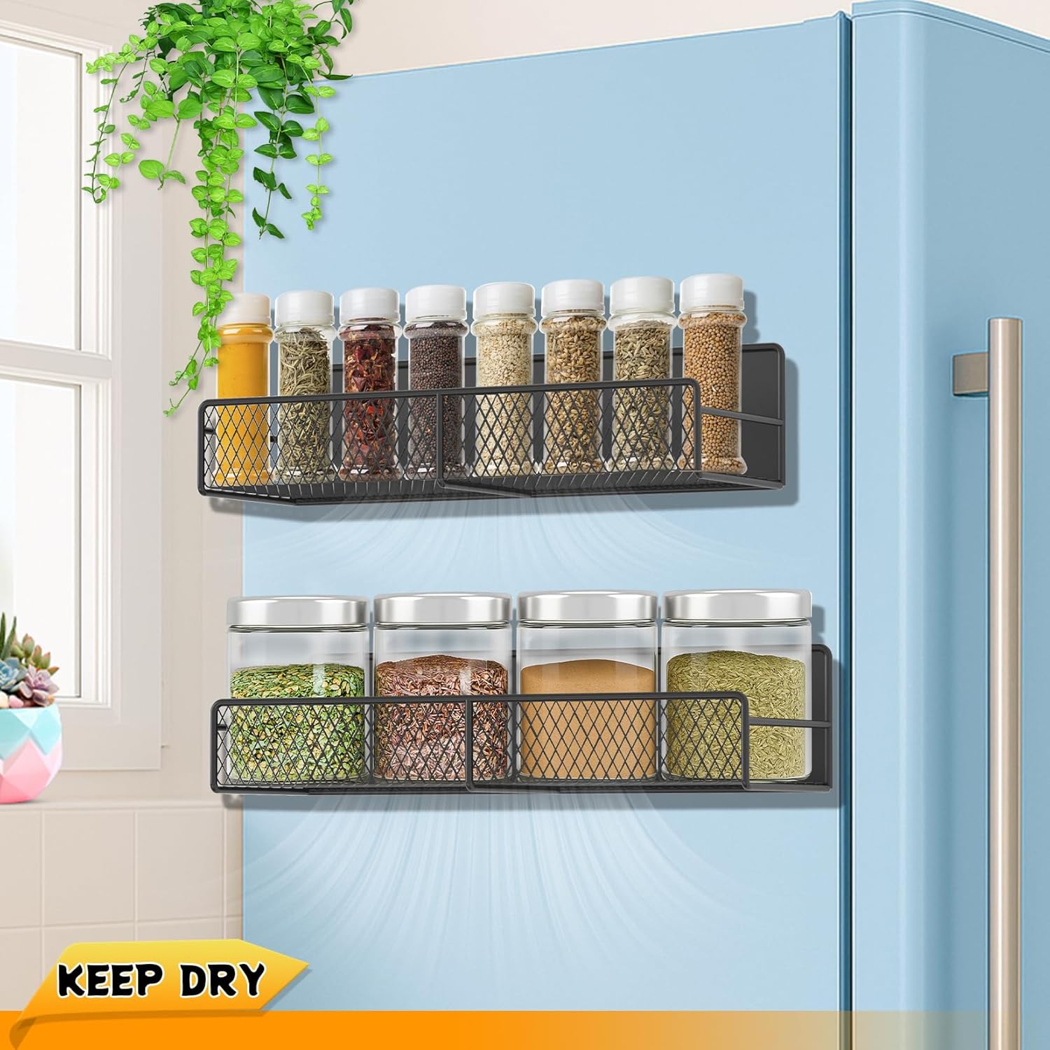 • Upgraded Mesh Metal Design – Built from thick, powder-coated steel mesh, these magnetic spice rack for refrigerator are rustproof, waterproof, and designed to last. The breathable grid structure keeps your spices dry, clean, and visible at a glance