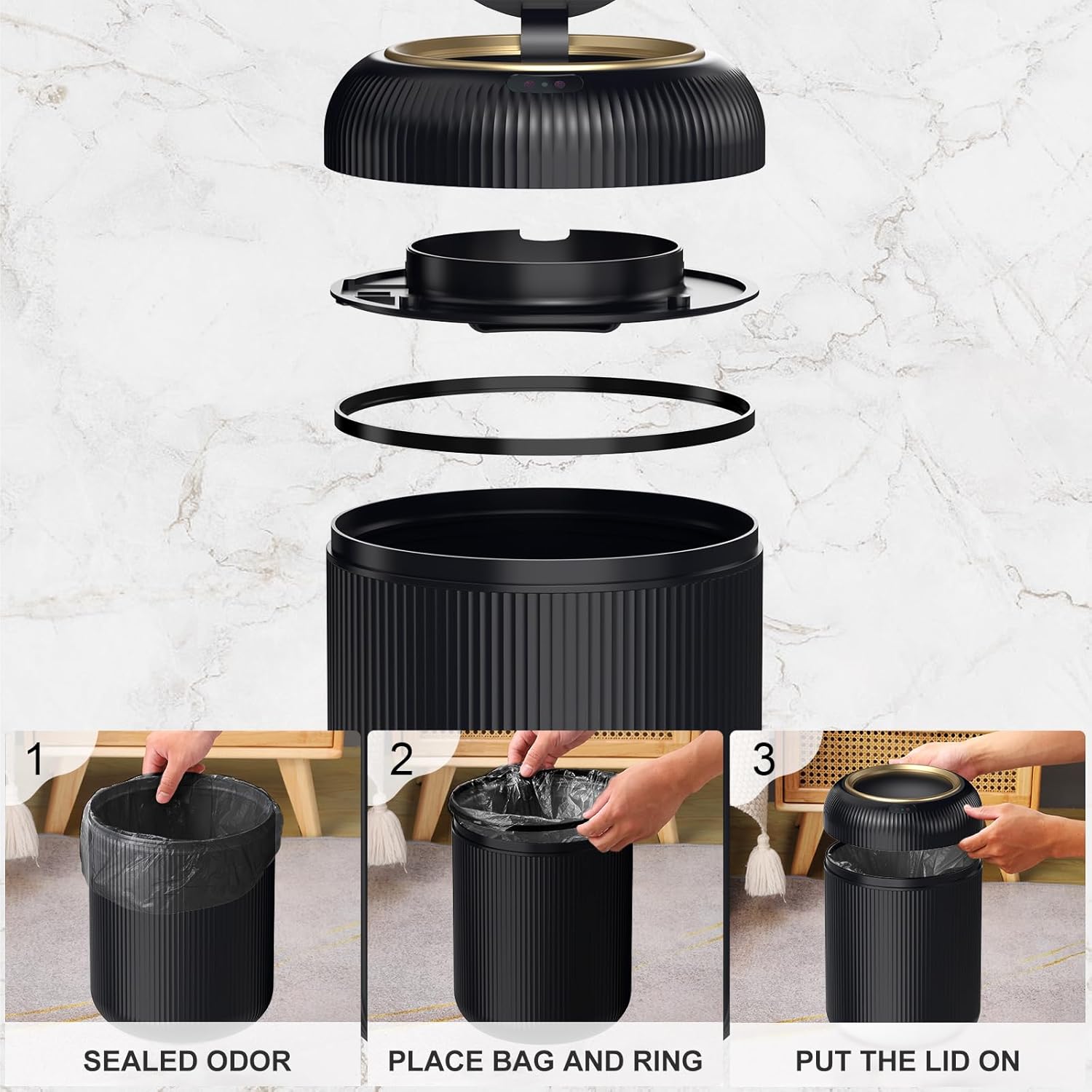 • 【Odor Control & Silent Operation】The no touch diaper pail effectively seals in odors, ensuring a fresh home environment. Its soft lid design minimizes noise, delivering a quiet experience during use.The inside of the black and gold trash can comes with a black pressure ring. Take it out and put a garbage bag over it, you can hide the unpleasant bag inside.