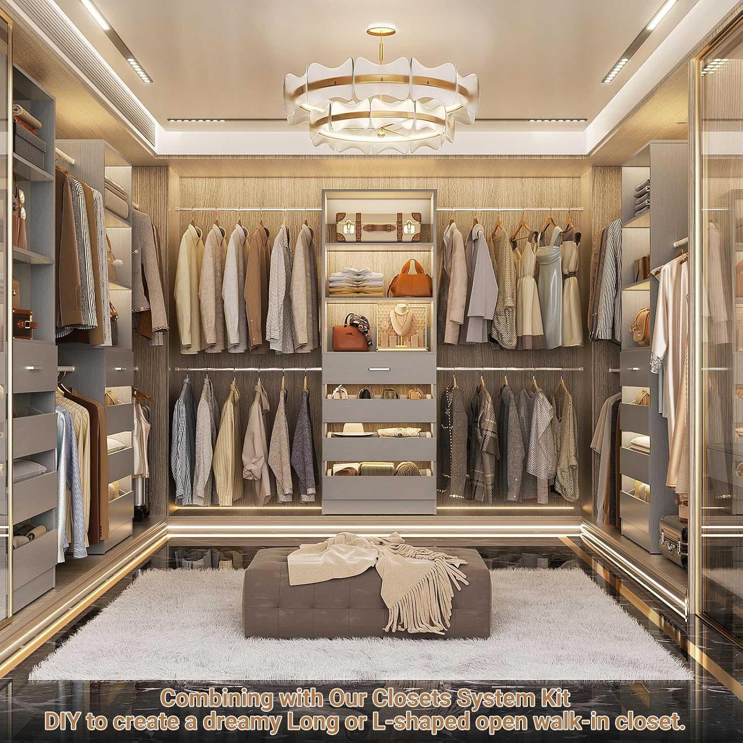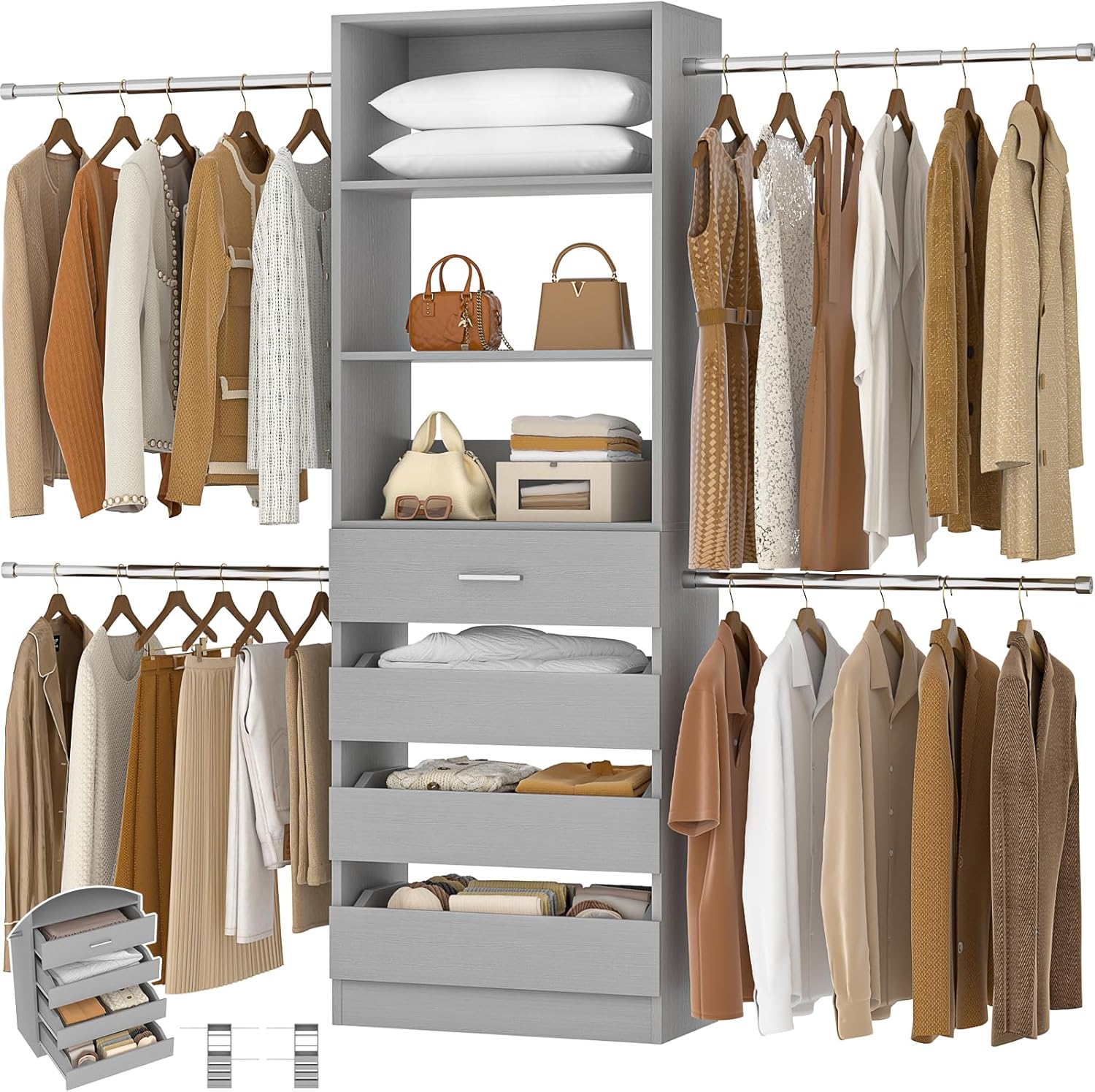 Aheaplus Closet System, 4-9Ft Closet Organizer with 4 Wooden Drawers, Wood Closet Organizer System with Tower, Walk-in Closet Organizer Wardrobe Garment Clothes Rack with 4 Hanging Rods, Grey