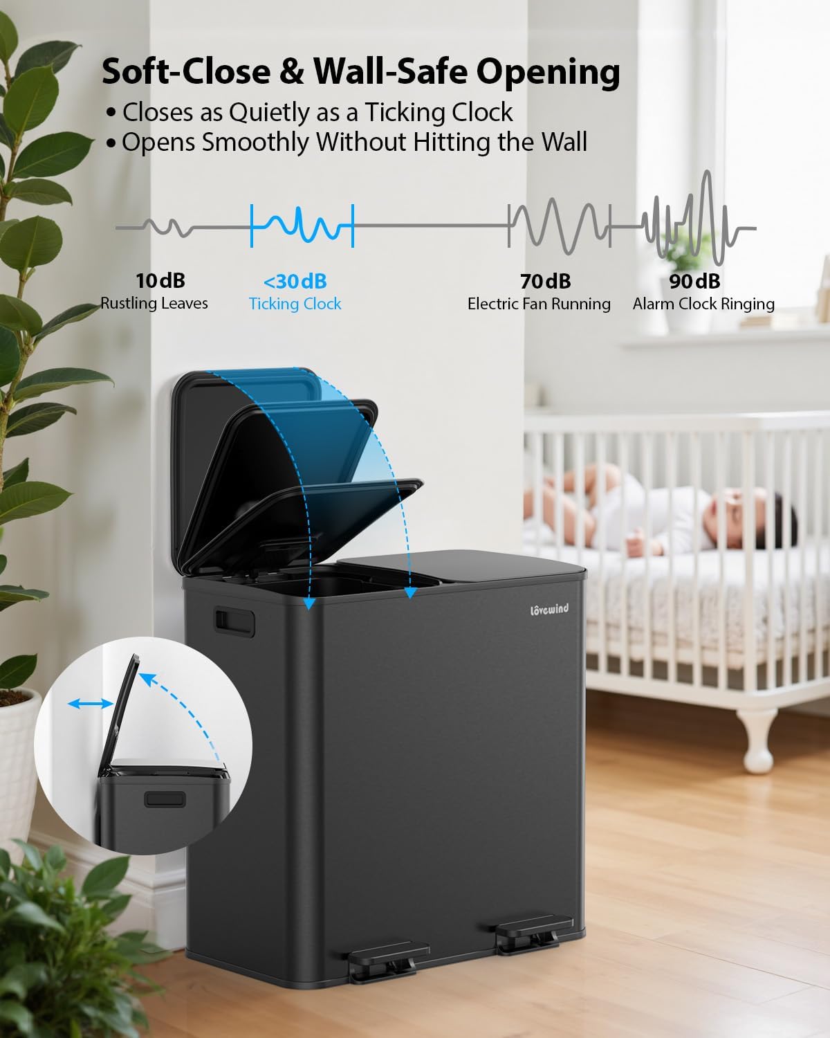 • Whisper-quiet Closing: The recycle bins for kitchen feature a soft-close mechanism that allows the lid to close gently, slowly, and silently