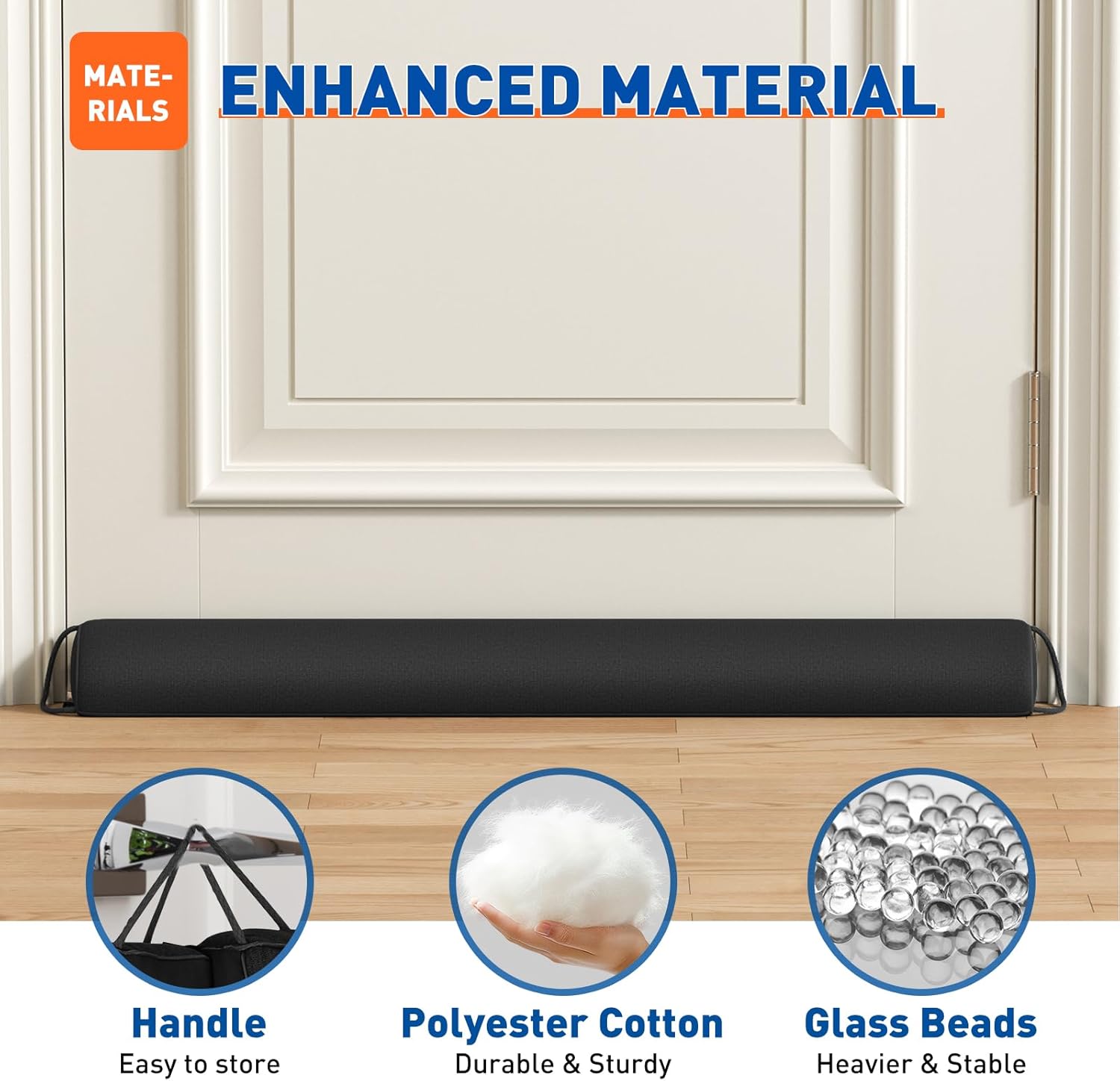 • ENHANCED MATERIAL – This under door draft stopper is made with soft cotton and filled with glass beads for added stability, improving thermal, soundproof and dustproof performance. It weighs 2.18 lbs and fits the door snugly.