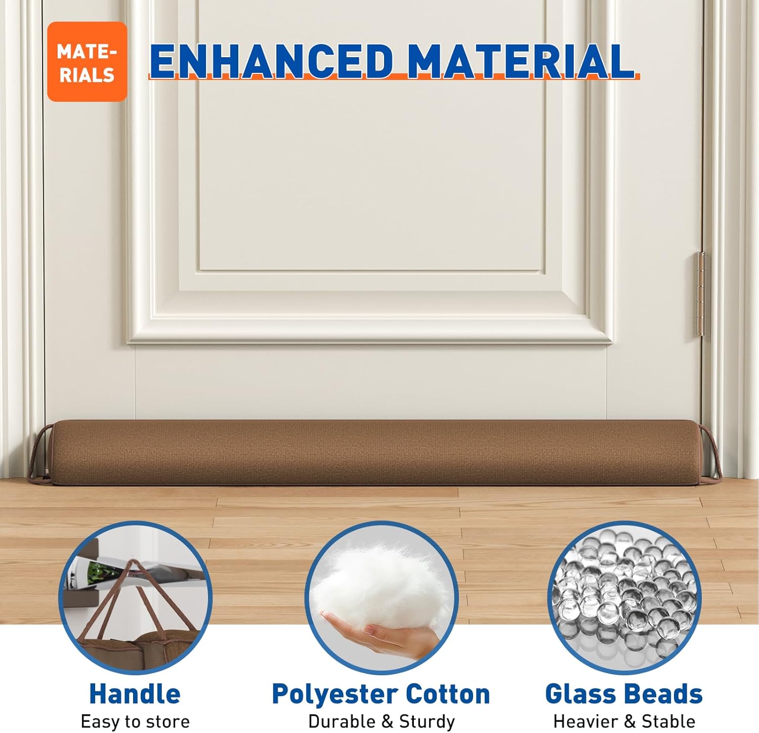 • ENHANCED MATERIAL – This under door draft stopper is made with soft cotton and filled with glass beads for added stability, improving thermal, soundproof and dustproof performance. It weighs 2.18 lbs and fits the door snugly.