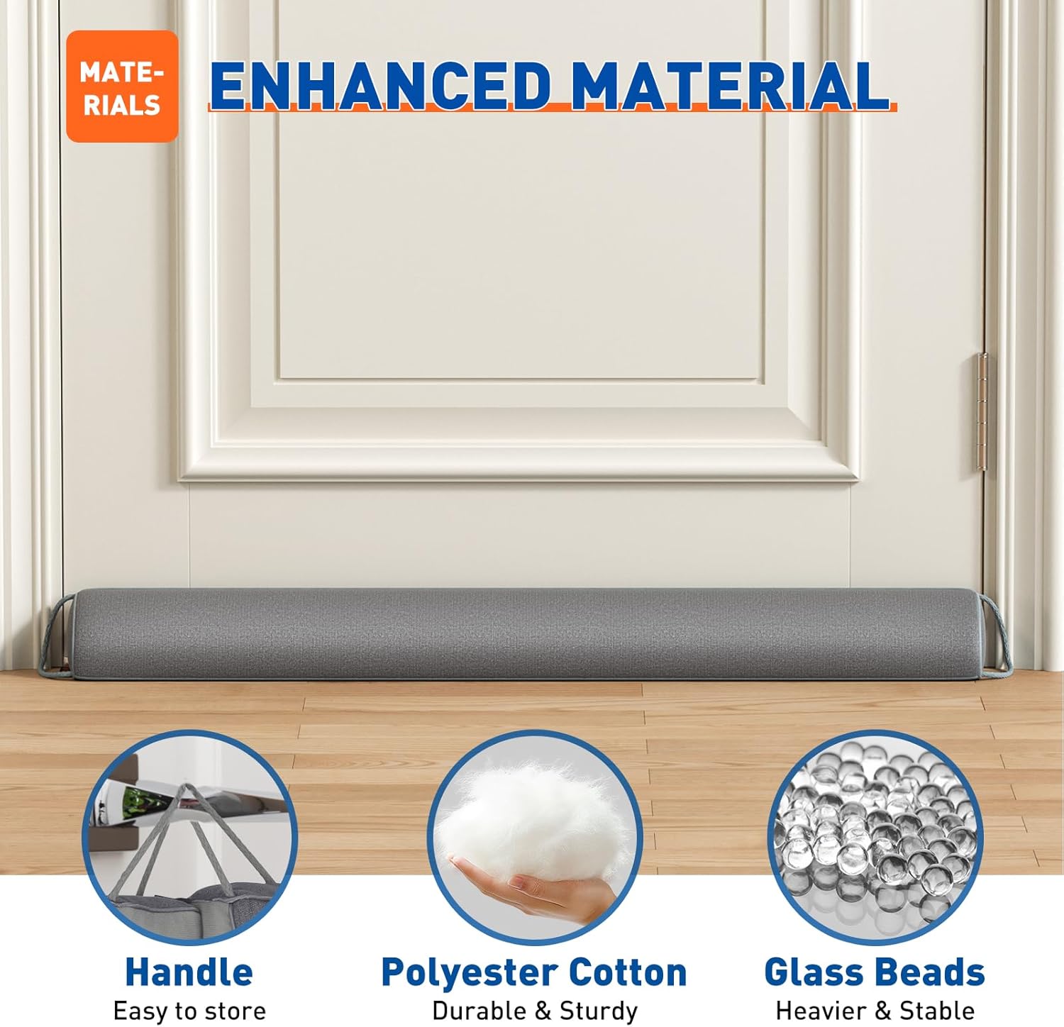 • ENHANCED MATERIAL – This under door draft stopper is made with soft cotton and filled with glass beads for added stability, improving thermal, soundproof and dustproof performance. It weighs 2.18 lbs and fits the door snugly.