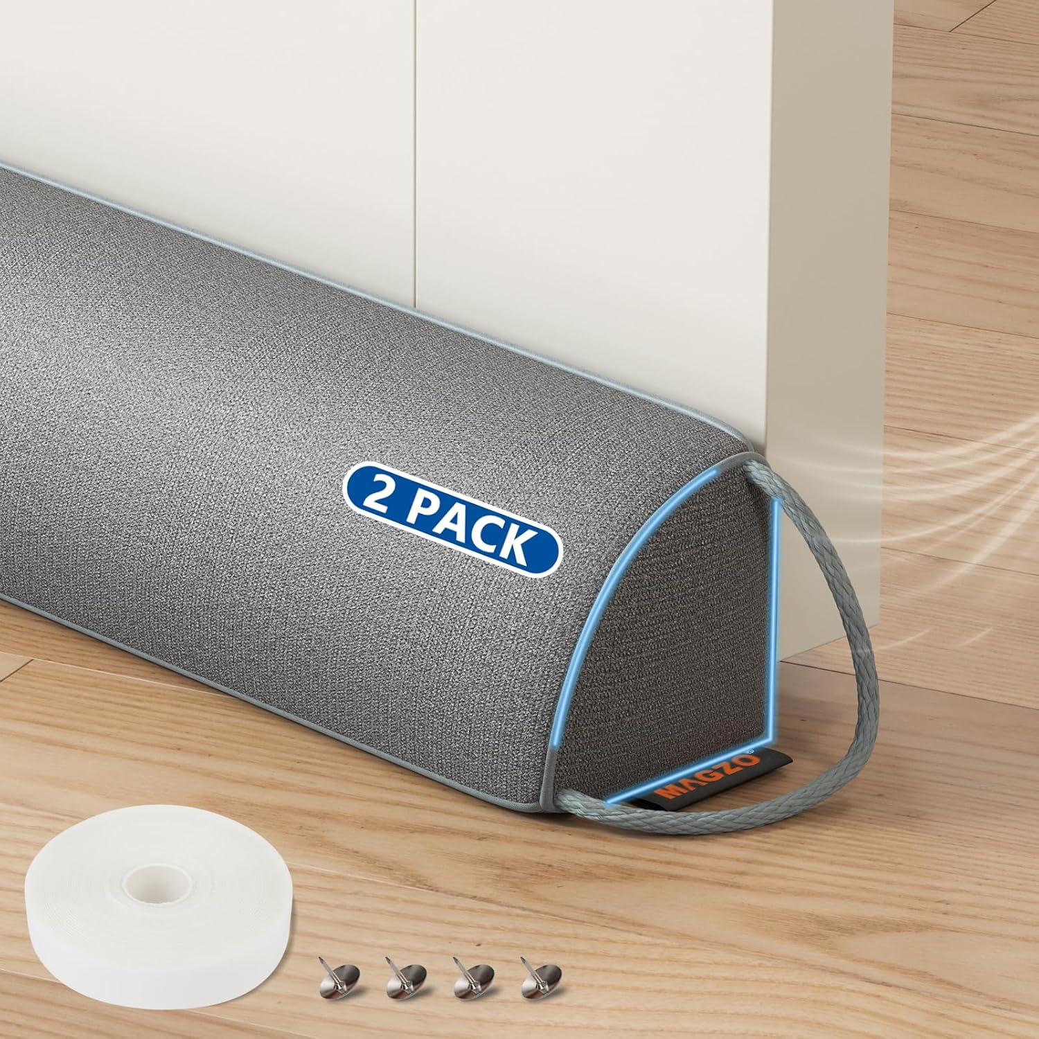 • SIZE – The door draft stoppers for bottom of door is 36" in length and covers gaps up to 3". Included in the package are 2 products, 2 velcro strips, 8 push pins and an instruction manual.