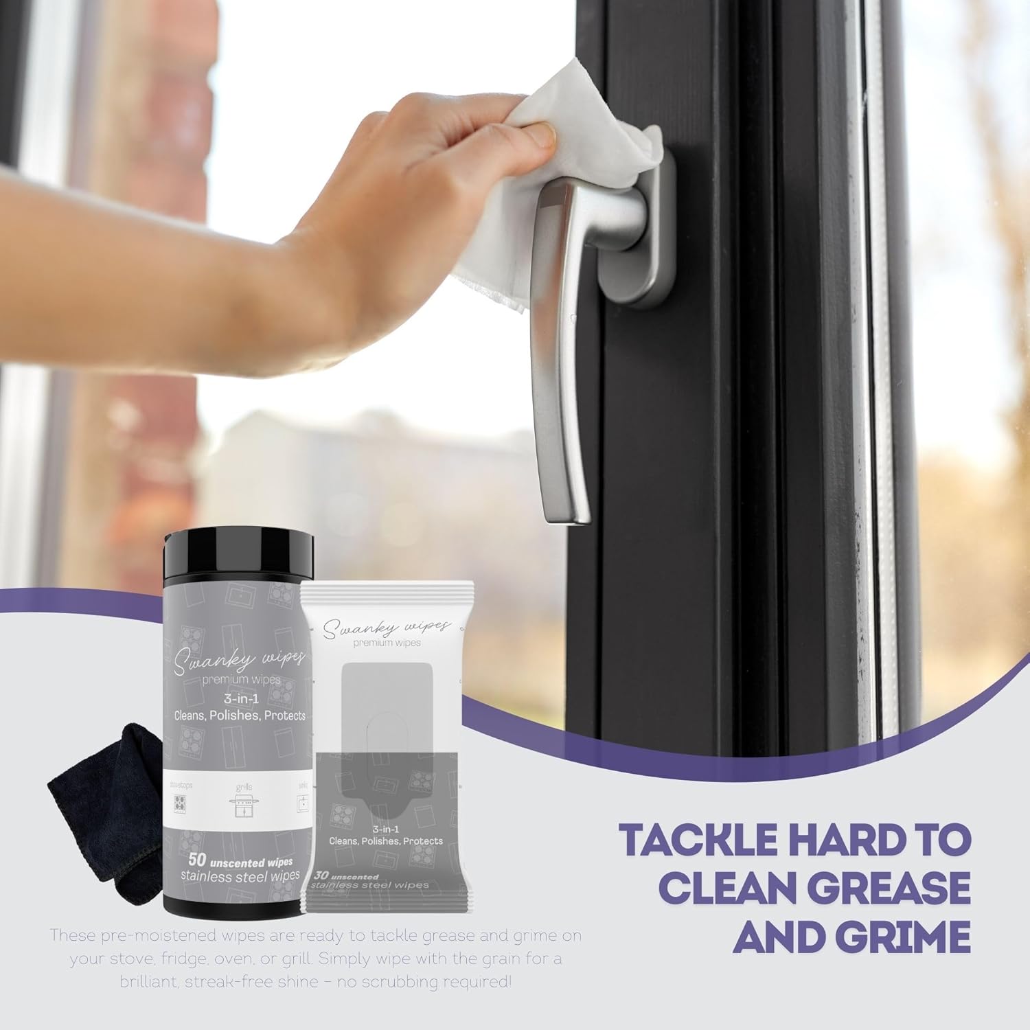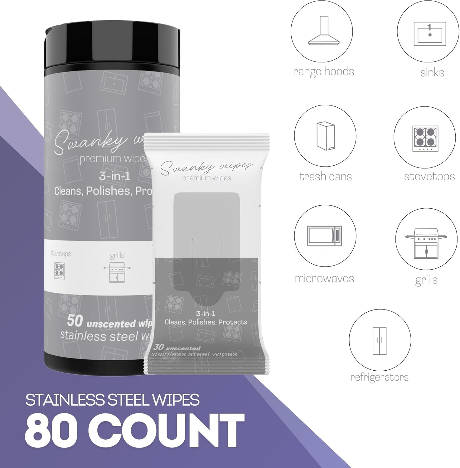 • STAINLESS STEEL CLEANING - Swanky stainless steel wipes polish, clean, and protect your stainless steel appliances. These wipes efficiently remove water marks, grease, and grime, leaving your appliances with a streak-free shine.