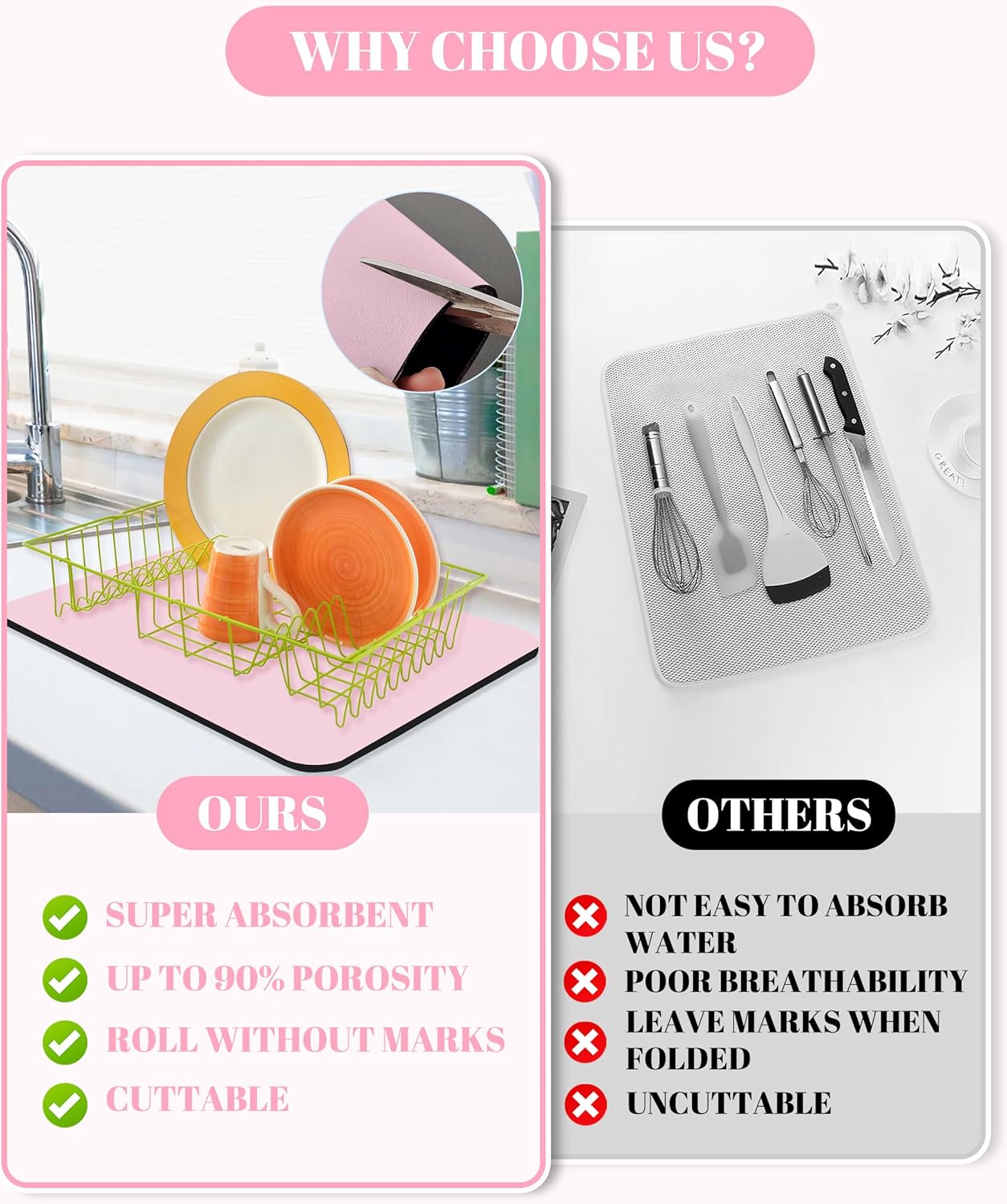 Dish Drying Mat for Kitchen Counter, 16"x24" Dish Drying Pad with Non-slip Rubber Backed, Hide Stain Anti Absorbent for Kitchen Counter, Drying Mat for Coffee Machine Dish Rack (Pink)