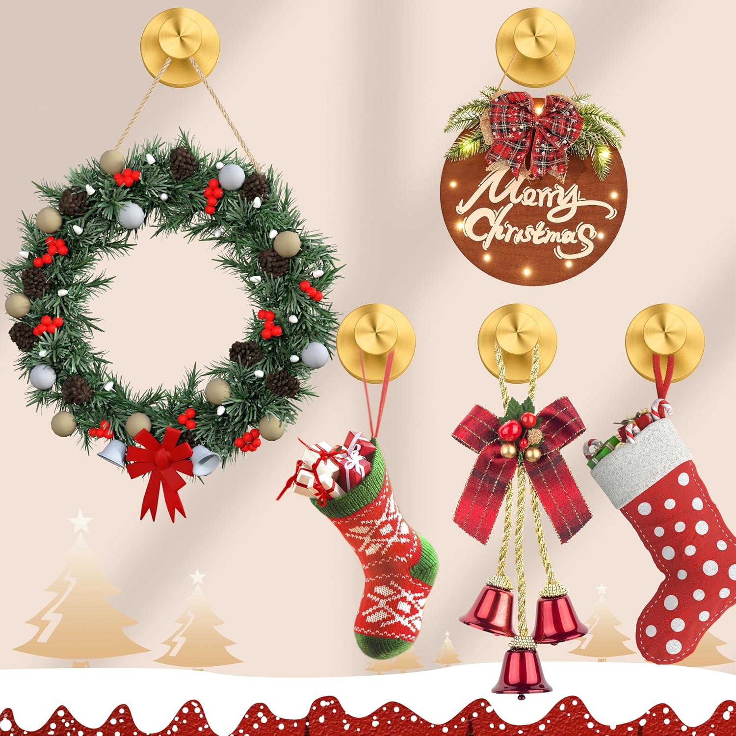 • 【Hangs Securely on 10+ Materials】The suction cup hooks are suitable for christmas decorations ,bathrooms,kitchens,windows, wreath hanger,heavy duty suction cups for glass.it can be fixed to fit tile, glass, mirror, marble, metal,acrylic,plastic,stainless steel and other smooth wall surfaces.,it can hang towels, loofahs, bathrobes,garland wreath and other items up to 15 lbs.