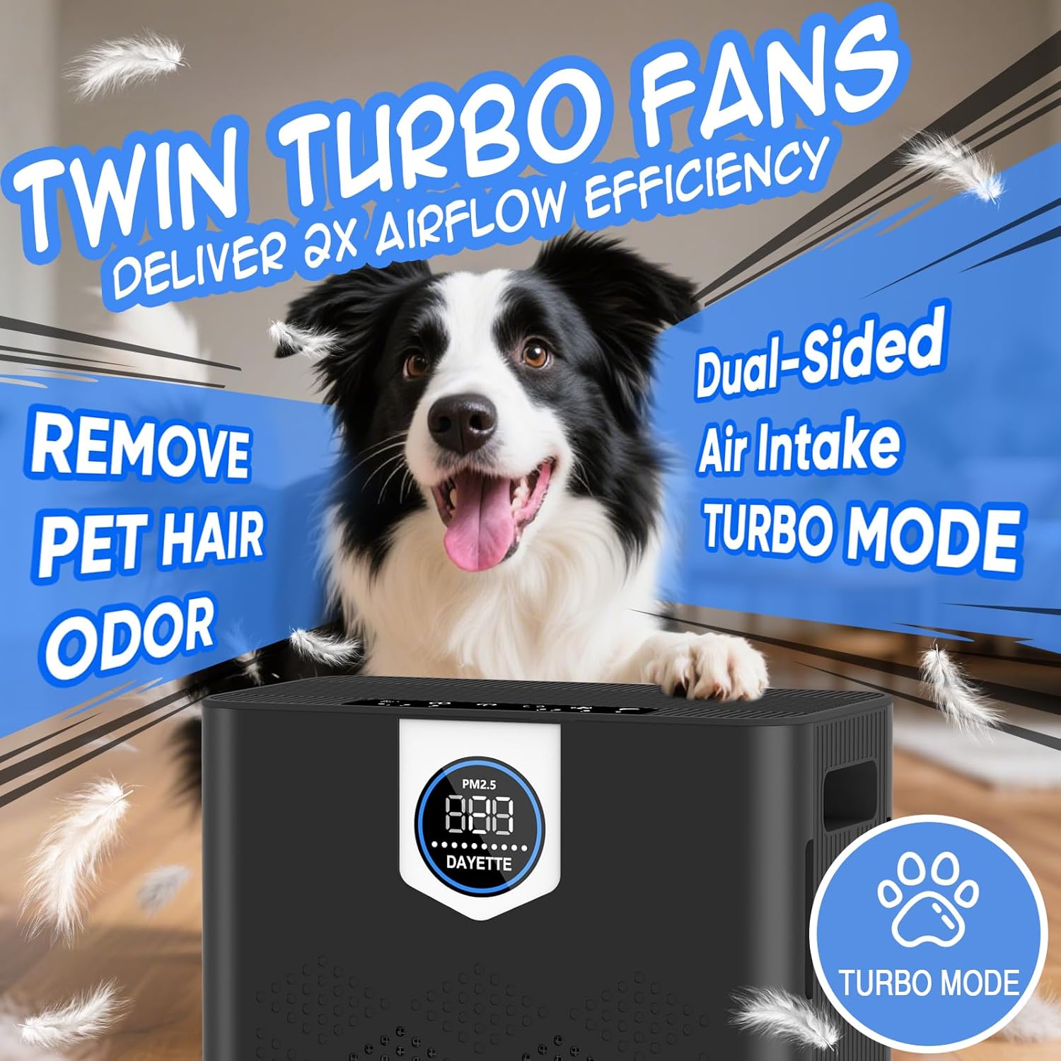 DAYETTE Air Purifier for Home Large Room Bedroom Up to 3000 Ft² with Washable Pre-Filter, Air Quality Monitor, HEPA Air Purifiers with Sleep Mode for Dust, Pollen,Black