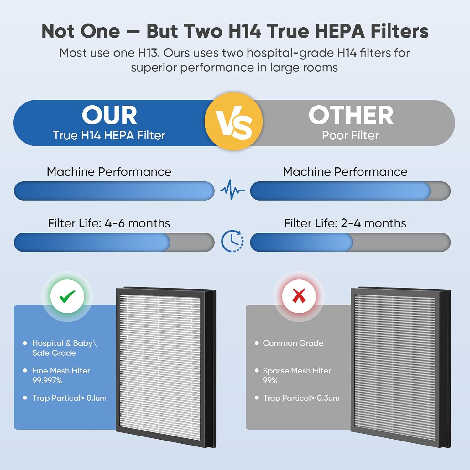 - 【2 x ADVANCED H14 HEPA FILTER]】Discover exceptional air quality with our new air purifiers for home, featuring two advanced H14 HEPA filters that capture 99.997% of particles as small as 0.1 microns—superior to H13 filter. Our Hepa air purifier combines a pre-filter, H14 HEPA filter, activated carbon filter, and net filter to achieve optimal performance. Efficiently removes dust, smoke, pollen, hair, and odors, ensuring you breathe easier and enjoy a fresher, cleaner home environment