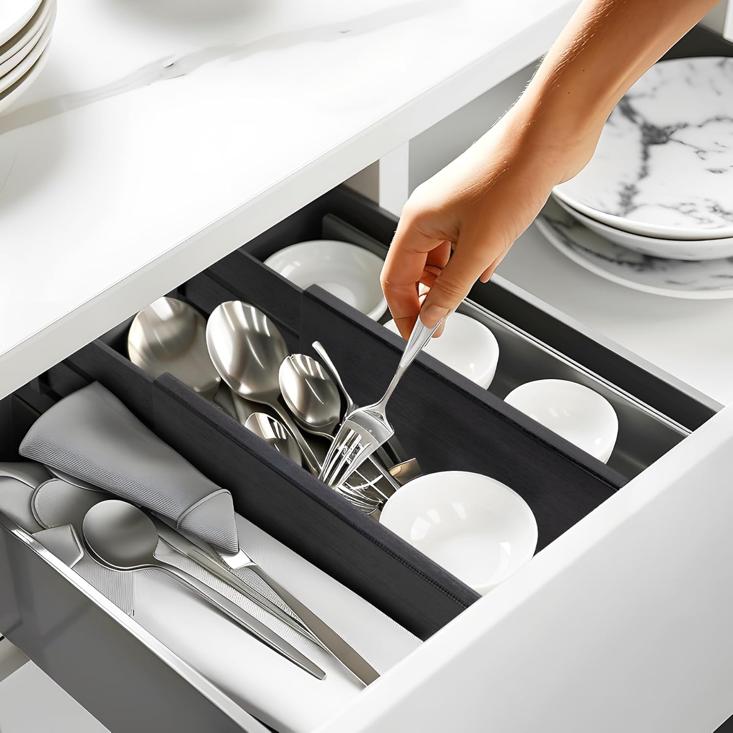 • Easy Installation & Removal: The expandable drawer divider features a built-in spring that keeps it securely in place. It's easy to adjust, so you can customize it to fit your changing needs. Ideal for sturdy drawers, ensuring your items stay organized