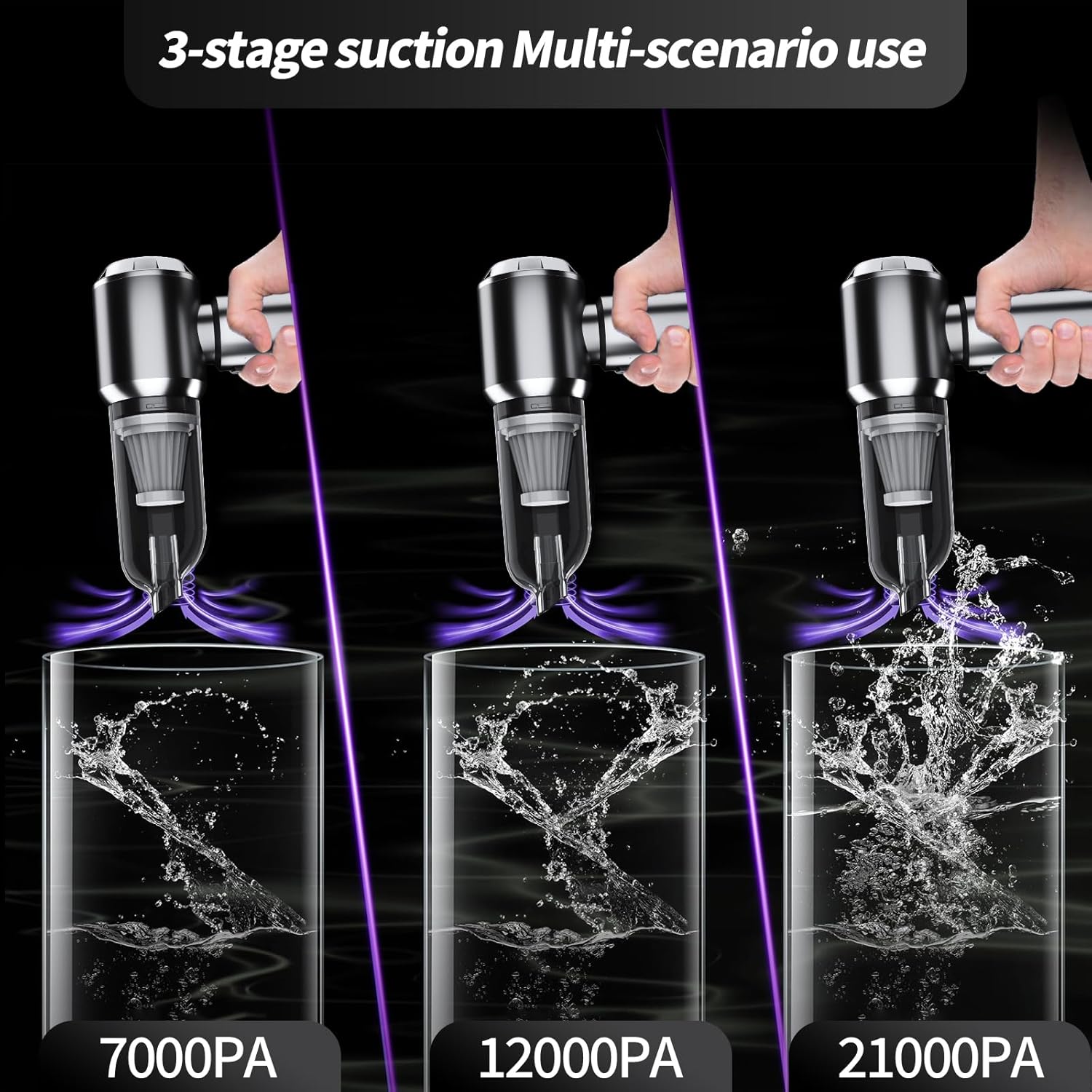 - 【Powerful Suction with Brushless Motor】Built in high-speed brushless motor, the car vacuum portable cordless offers 21000pa suction in max mode that is 3 times as strong as ordinary handheld vacuum with brushed motor, which can clean dust, crumbs, pet hair, and other large debris in seconds, either at home, office or in the car. Moreover, the hand vacuum provides third gears suction to meet standard/strong cleaning needs in daily life.