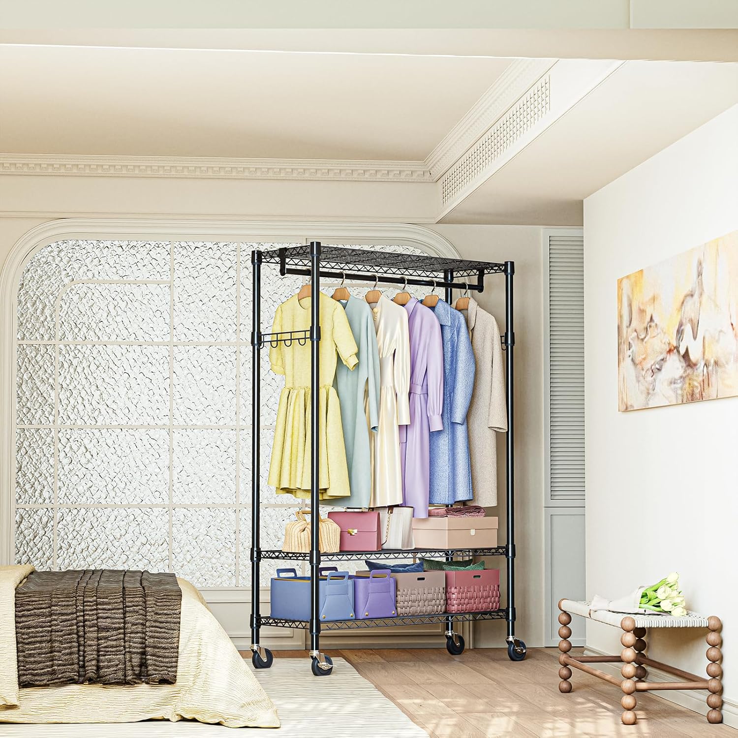 IZEUK Heavy Duty Rolling Garment Rack with 3 Adjustable Wire Shelves, 2 Hanging Rods & Side Hooks - Extra Large Mobile Clothes Rack with Wheels, 47.2" W x 17.7" D x 83.6" H, Black