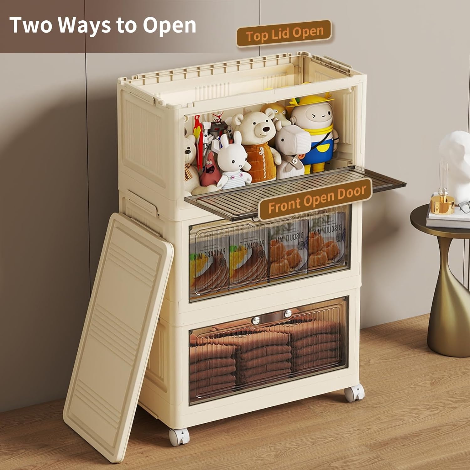 • Two Opening Ways: There are two ways to open the lid storage box. You can open the top cover or open it from the front door. The front cover of each plastic drawer storage is translucent, and you can clearly see the items stored inside, which is a good assistant to our family
