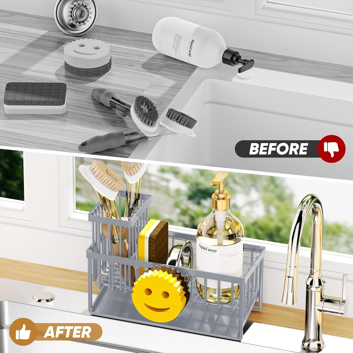 • Large Capacity & Saving Space:The measure of kitchen caddy sink organizer is 9.5"*4"*6.3",which is suitable for kitchens with limited space.It can be used for storing hand sanitizer,sponges,dish brushes,soap,and sink stopper etc.Saving space and keep your kitchen counter far more cleaner and tidy