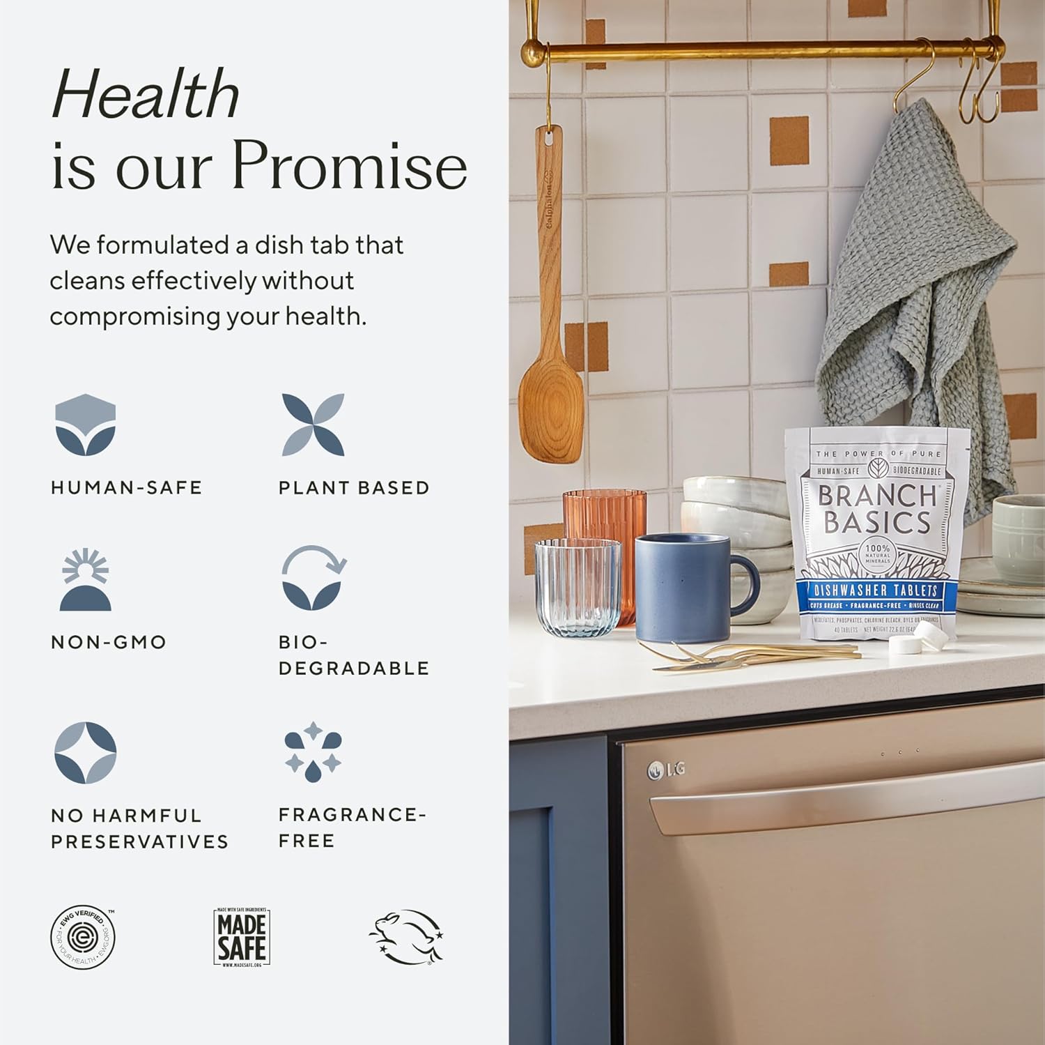Branch Basics Dishwasher Tablets – 40 Ct, 3 Pack | Plastic-Free, Fragrance-Free, Human-Safe | Delivers a Powerful Clean Without Harsh Chemicals