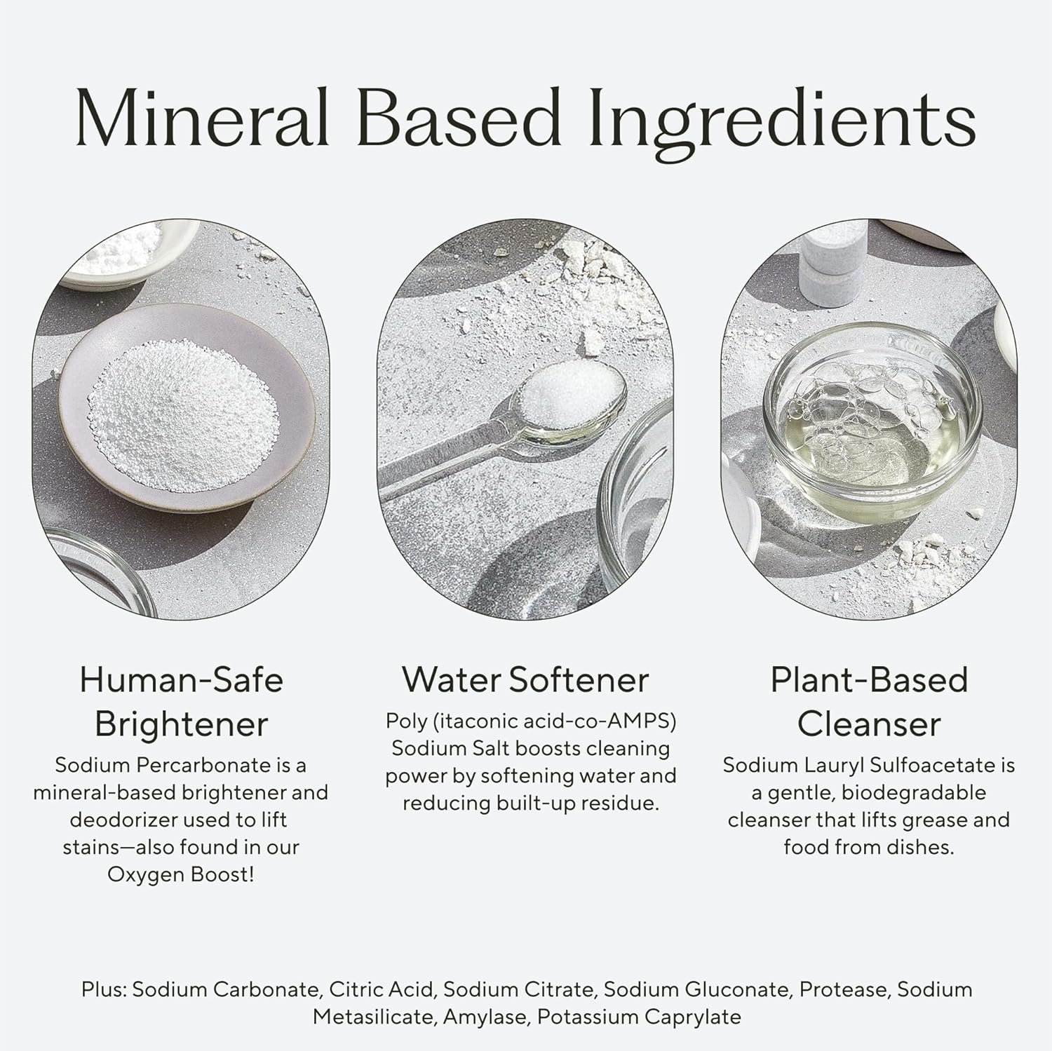 • HUMAN-SAFE, POWERFUL CLEANING: Our Dishwasher Tablets (40 per bag, 120 total) deliver a deep, effective clean without harsh chemicals, keeping your dishes, glasses, and utensils safe for your family. Made with a plant and mineral-based formula, these tablets are free from harmful preservatives, plastic film, synthetic fragrance, essential oils, sulfates, chlorine, phthalates, dyes, bleach, and ammonia. Designed to soften water, cut through grease, and remove stuck-on food, they rinse away completely—leaving nothing behind but spotless dishes.