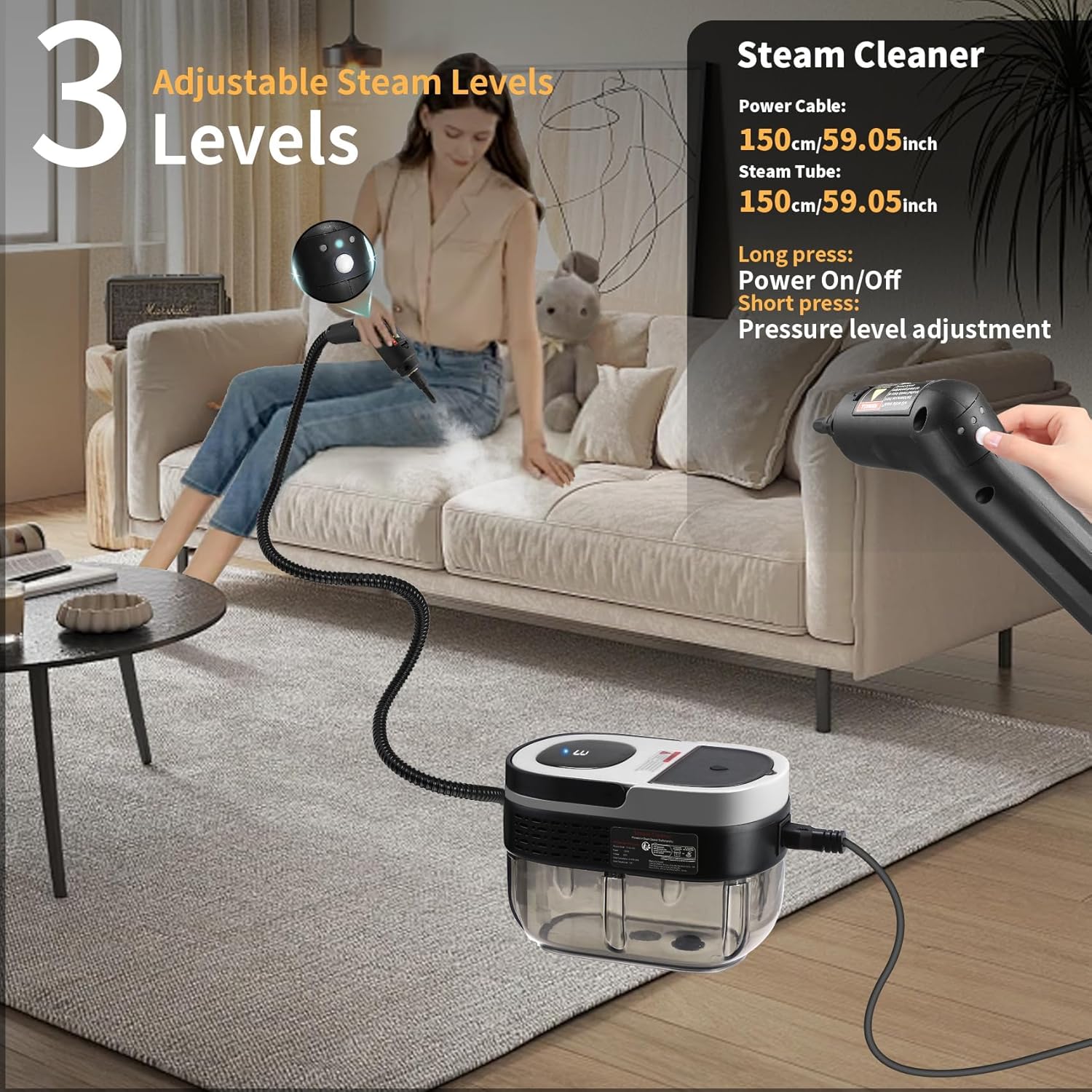 • 【3-level Adjustable Knob】The handheld steam cleaner features a 6-level adjustable knob, allowing you to fine-tune the steam intensity to suit a variety of daily cleaning tasks. Additionally, it delivers approximately 3 bar of high-pressure steam, with the capability to heat up and release high-temperature steam in just 10 seconds, effectively loosening and dissolving dirt for efficient cleaning