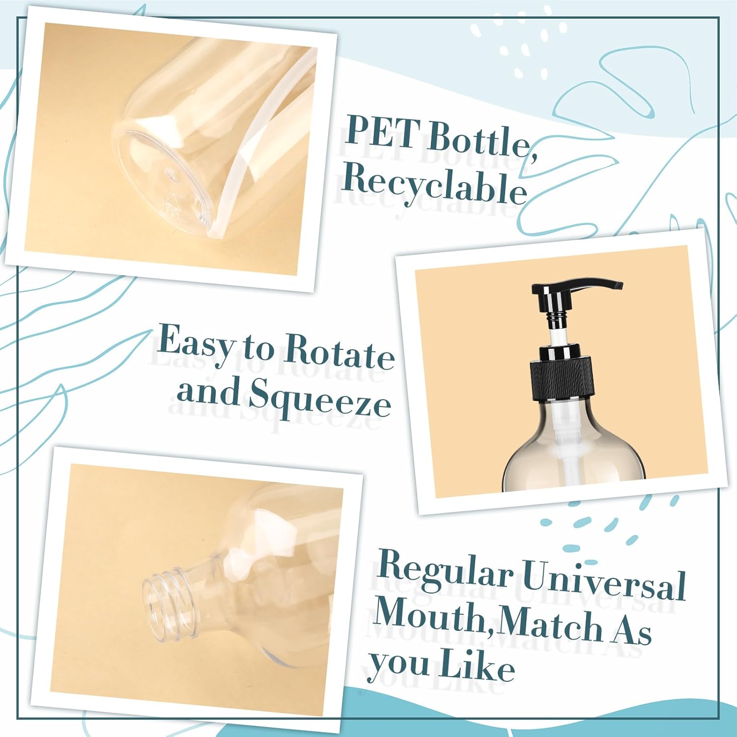 • Easy to Push: the pump of the plastic soap dispenser is smooth and easy to push down, so you can control the amount of the lotions and avoid wasting problem, besides, the pump has nice airtight ability, can effectively avoid leaking and dripping risks