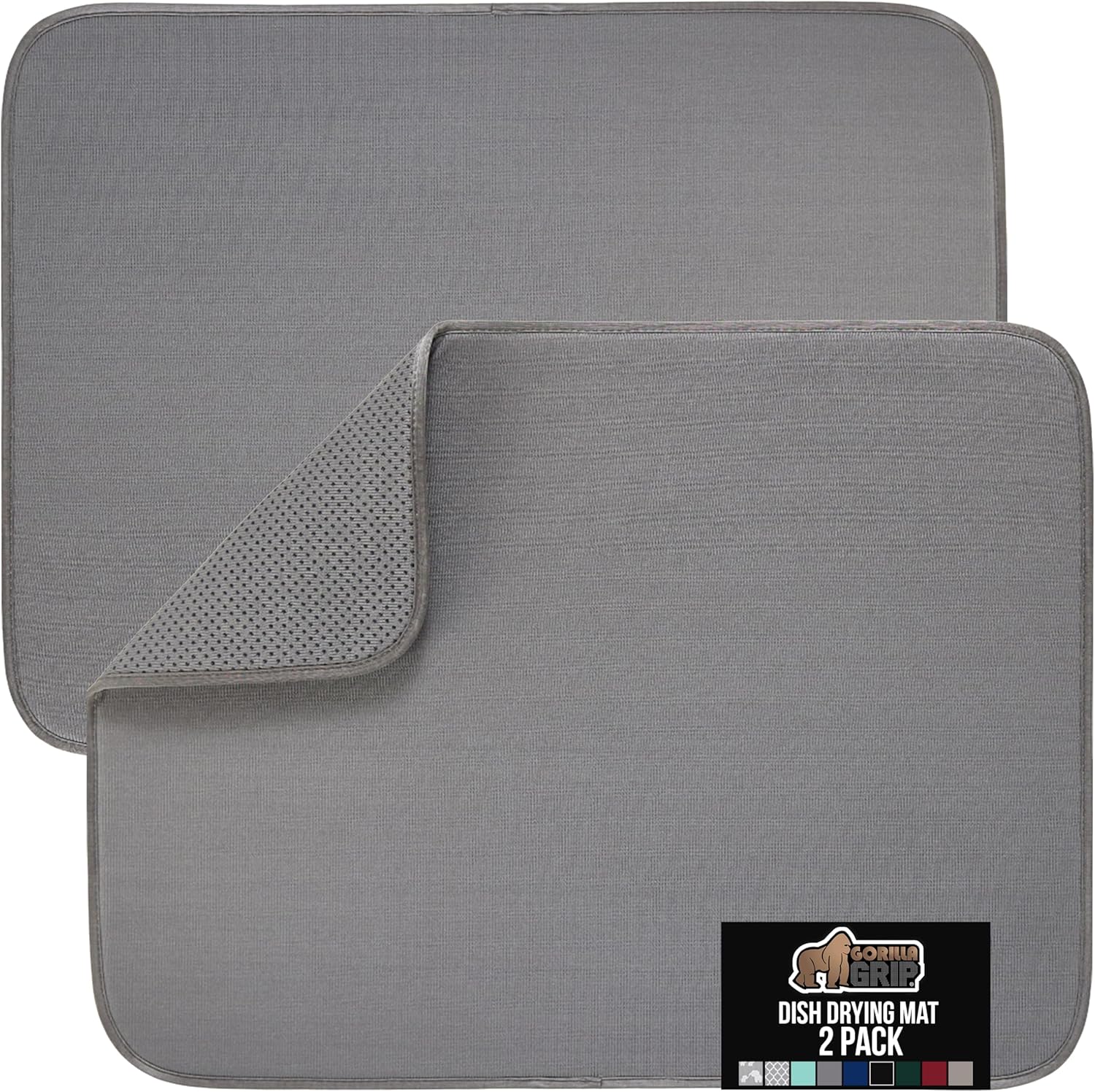 GORILLA GRIP Ultra Water Absorbent Microfiber Dish Drying Mat, 18x24, Quick Dry Thick Mesh, Slip Resistant Pad for Sink Dishes or Under Rack, Kitchen Counter Accessories, Machine Wash, 2 Pack Gray