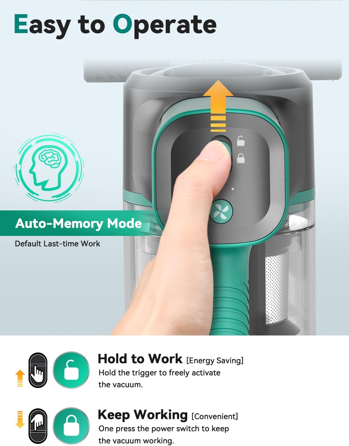 - 【Free to Choose Working Modes & Free Self-standing】- There are 2 Working Modes to choose: 1) Hold to Work Mode -Hold the trigger to freely activate the floor vacuum. 2) Keeping Working Mode - One press the power switch to keep the floor vacuum working. The cordless stick vacuum will default to the last used working mode. The S10K cordless stick vacuum cleaner can free self-standing without any outside support, let you be able to keep the vacuum cleaner in place at any time during the cleaning process