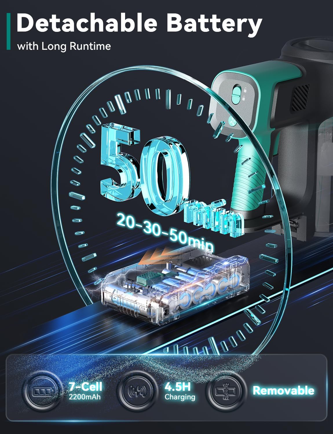 - 【Detachable Rechargeable Battery & 50mins Long Runtime】- Our cordless vacuum cleaner adopts a 2200mAh 7-cell large rechargeable battery, provides up to 50 minutes runtime in min suction mode. The battery detachable design makes it easy to be recharge separately. Item comes with a wall mount which can hold the stick vacuum cleaner to charge