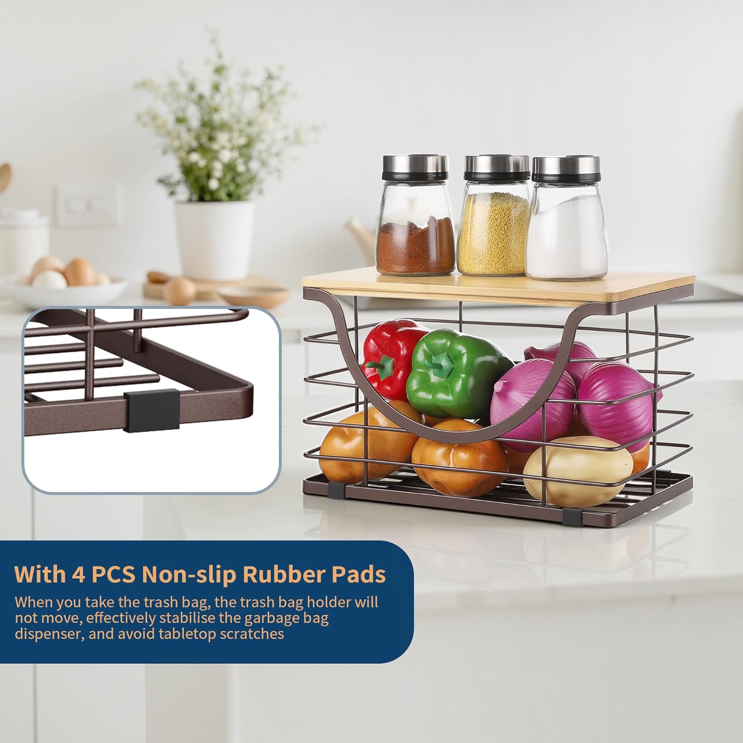 • High Quality and Fine Workmanship - Trash Bag Holder Dispenser is made of stainless steel basket and bamboo lid, corrosion and rust resistant, smooth edges, sturdy and durable. Hollow out design allows you to see the household items inside, easy to check your trash bag and replenish it at any time