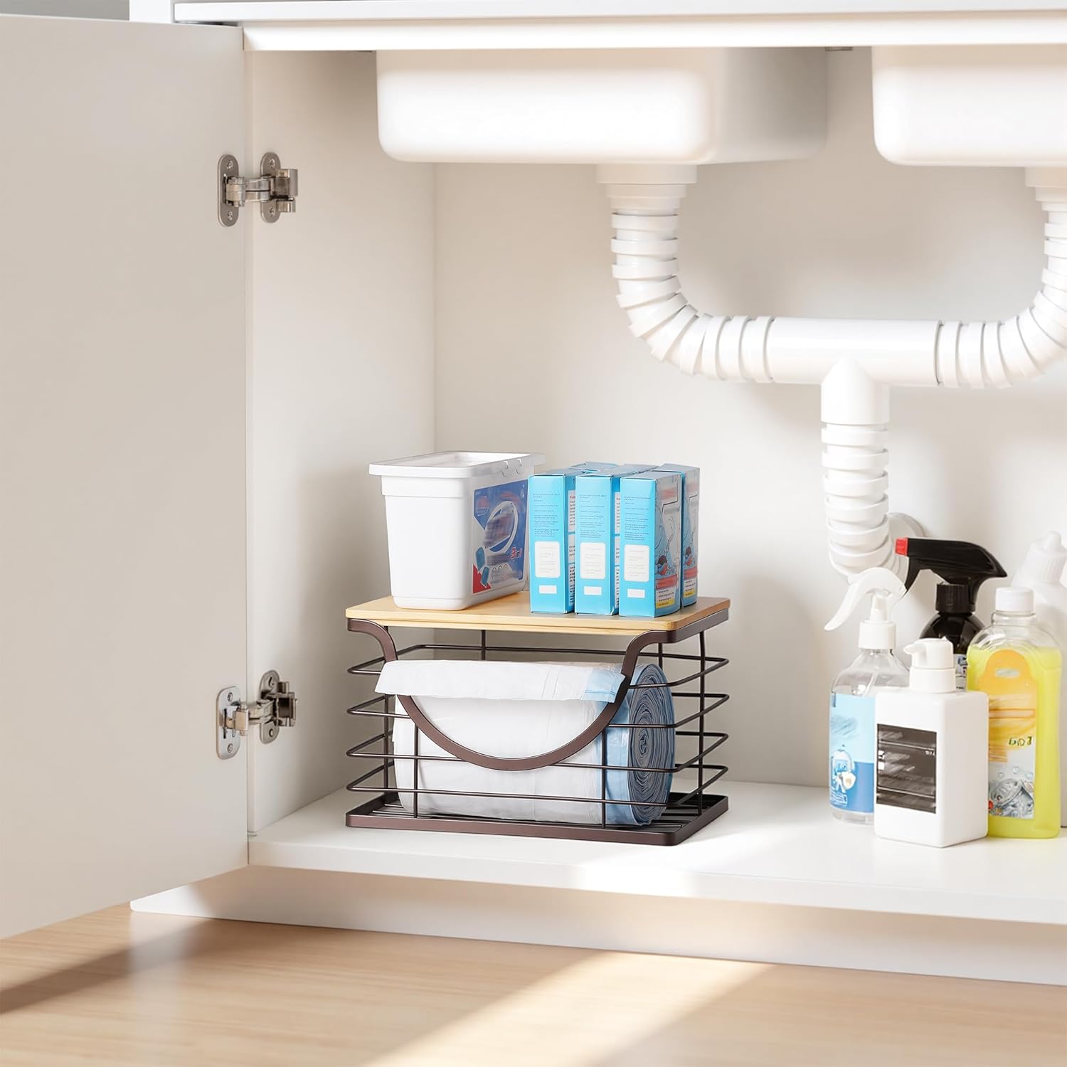 Extra Large Trash Bag Holder Under Sink Stackable Kitchen Storage with Lid, Garbage Bag Dispenser Roll Holder, Wall Mounted Trash Bag Container, Laundry Room Organization Storage, Brown