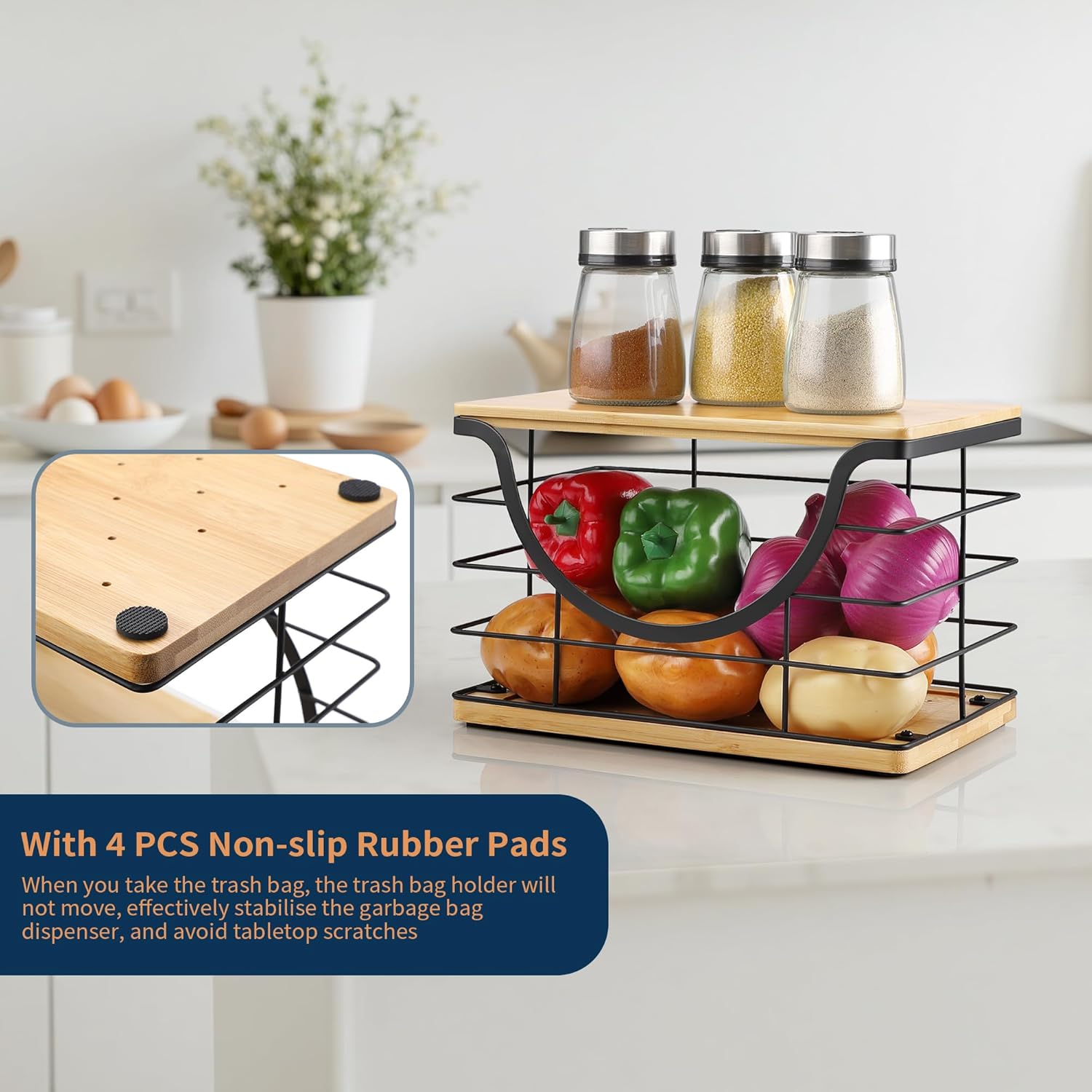 • Practical and Space-saving - no assembly required. trash bag holder dispenser has a large front opening and a removable bamboo lid for easy access to items. In addition, other items can be stacked on the bamboo lid to save more space
