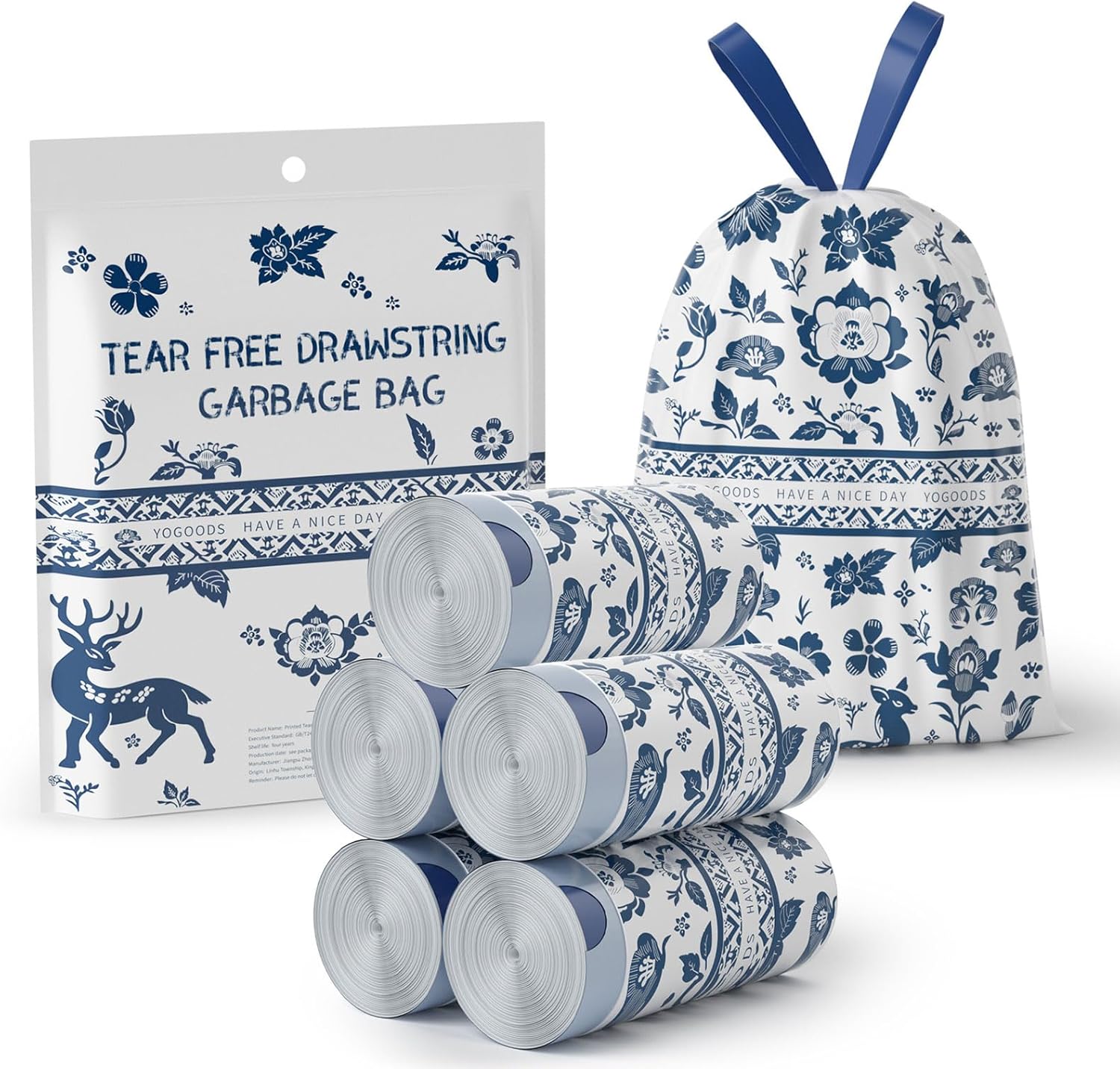 VOK 4 Gallon Trash Bags Drawstring, Printed Small Garbage Bags with Secure Tie, Tear-Resistant & Leakproof Design for Bathroom/Bedroom, Decorative Odor-Control Trash Can Liners, 160 Counts