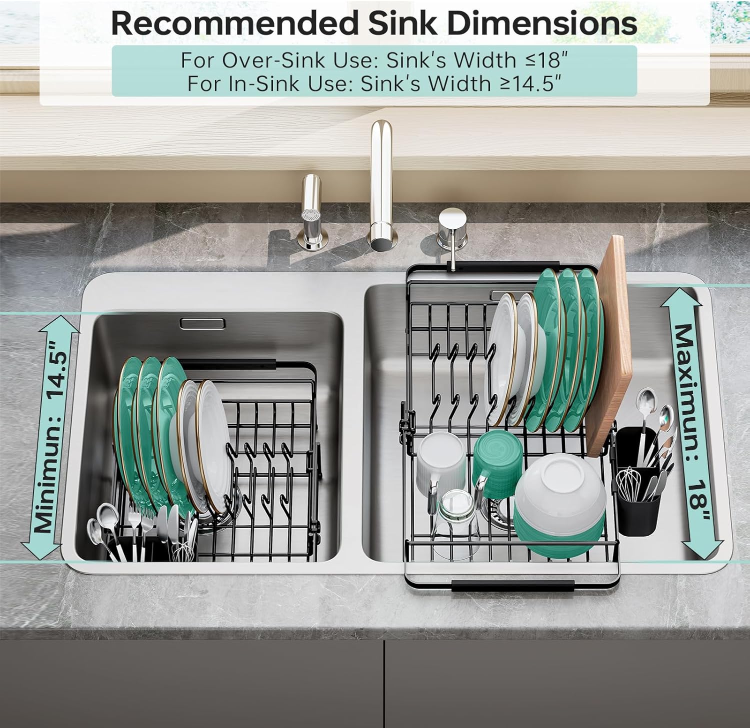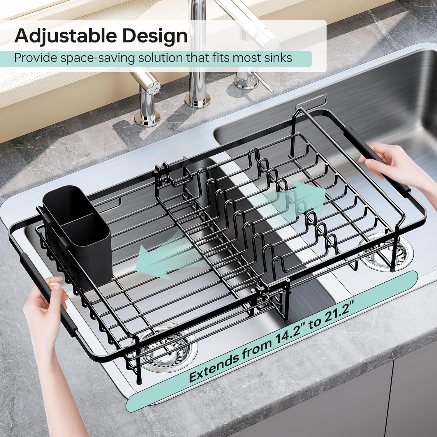 Dish Drying Rack in Sink - Expandable (14.5''-18''L) Over The Sink Dish Rack with Utensil Holder, Space-Saving Dish Drainer for Kitchen Counter, 1 Piece, Matte Black