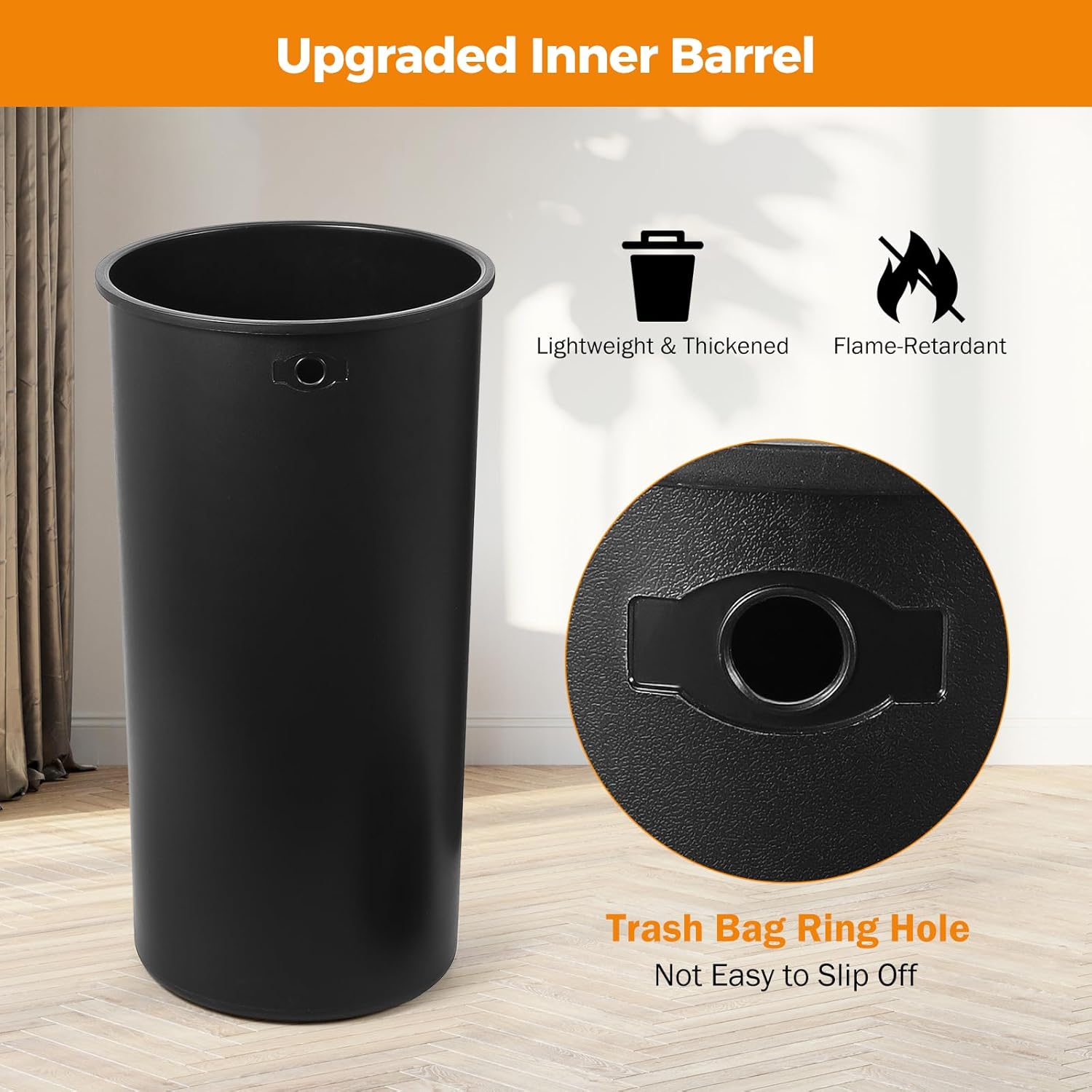 • **Removable Inner Bin & Easy Lift-Off Lid** The BEAMNOVA commercial heavy-duty trash can includes a detachable inner bin for easy cleaning and maintenance. The lid lifts off smoothly, allowing for quick and hassle-free bag changes while keeping the bag discreetly hidden for a tidy look.