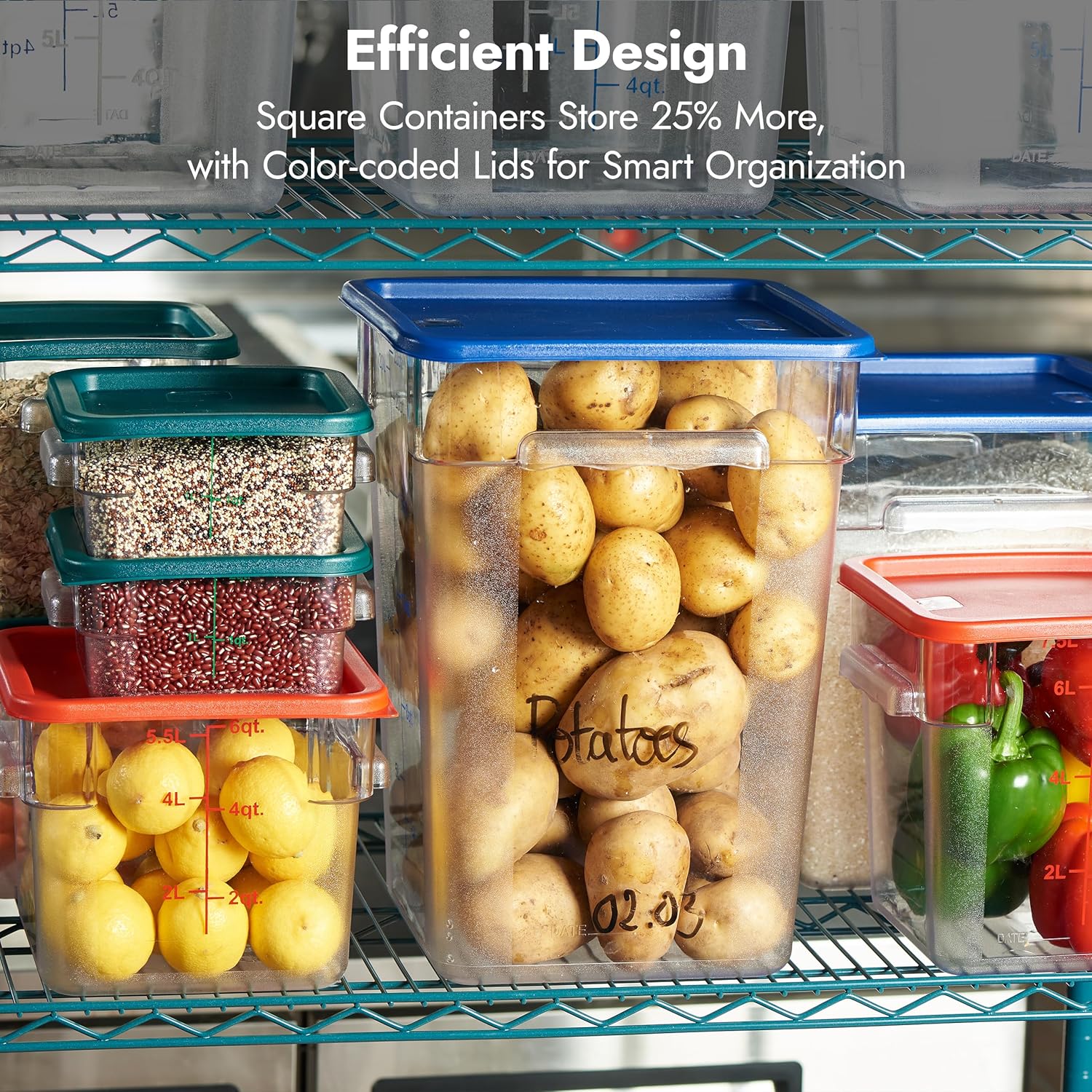 - Smart Space-Saving Design with Bold Graduations - Their square shape stores up to 25% more than round containers and stacks securely with lugs that prevent sliding. Bold Blue quart/liter markings ensure quick, accurate measuring, helping you manage bulk ingredients with confidence and efficiency.