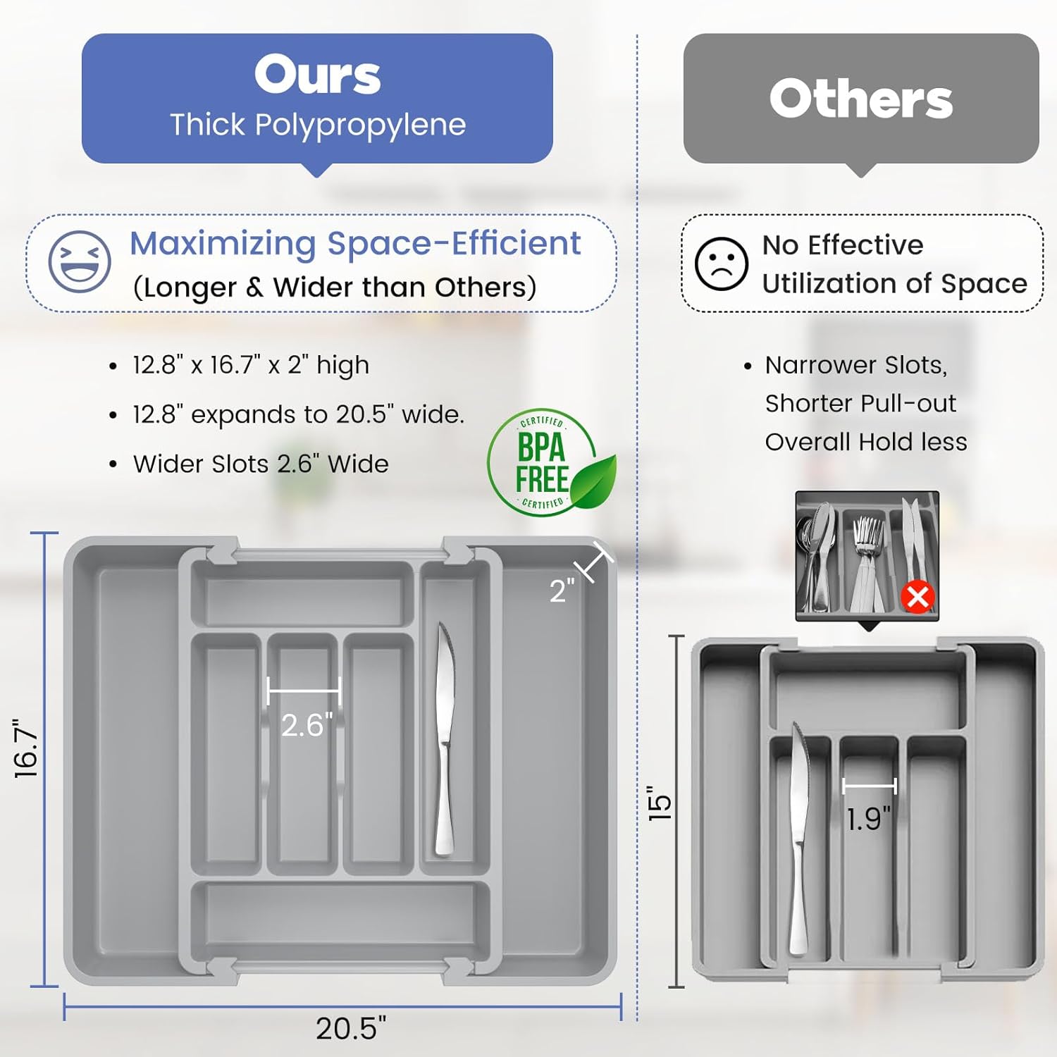 - Adjustable Width: Our expandable cutlery drawer organizer features 6 compartments when closed and 8 compartments when expanded. Measures 12.8" x 16.8" x 2" high; expands to 20 1/2" wide. Fits most standard-sized kitchen drawers.