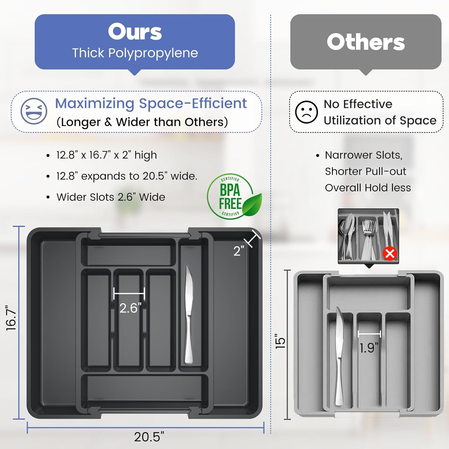 - Maximize Drawer Storage: Caperci silverware drawer organizer features significantly longer depth & wider compartments, the center compartments for flatware and two expanding sections for serving utensils and cooking tools.