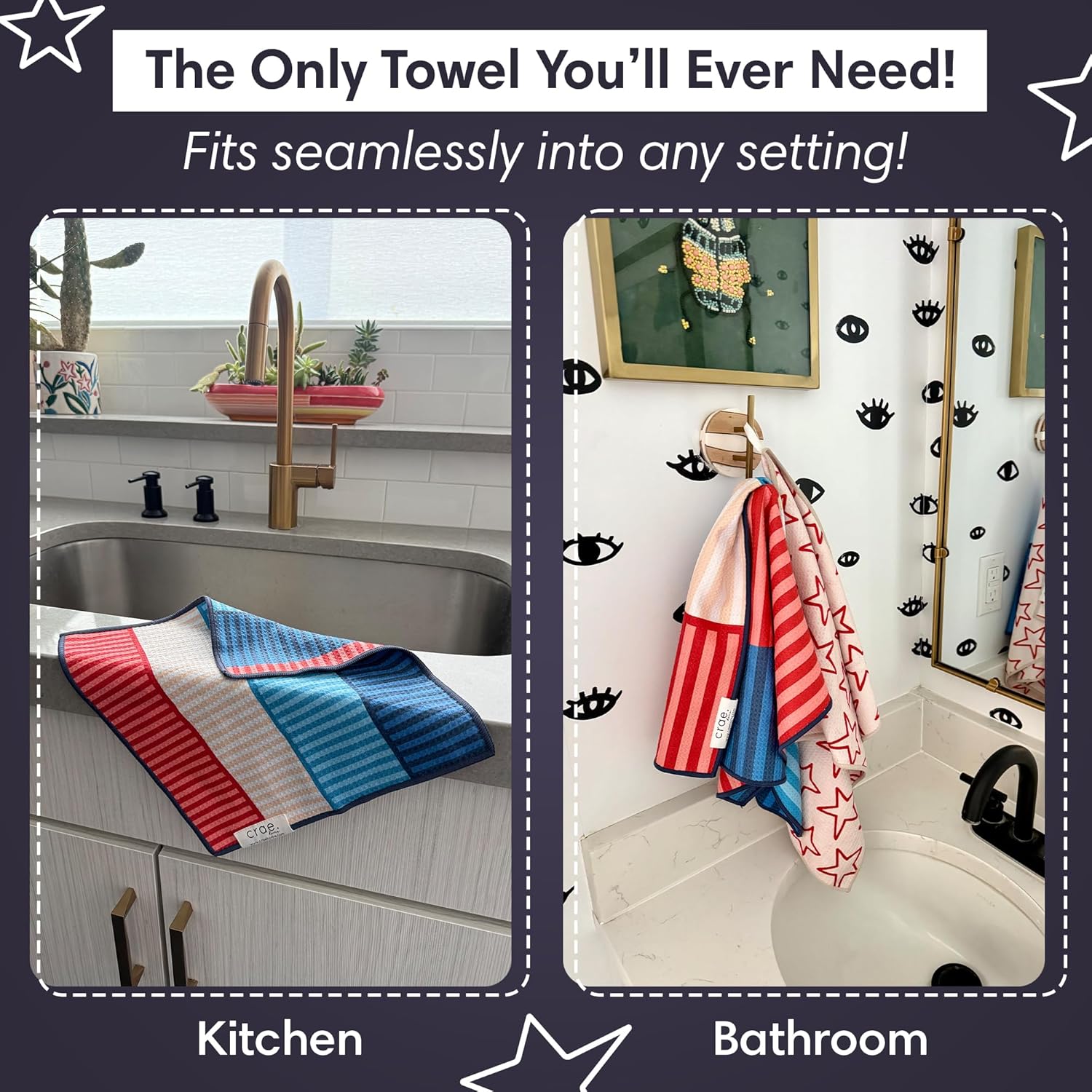 Microfiber Hand Towel & Washcloth Set of 2 - Double-Sided, Waffle Weave, Super Absorbent, Lint-Free, Fast Drying - Stars & Stripes Pattern for Bathroom, Kitchen, Car, and Window Cleaning